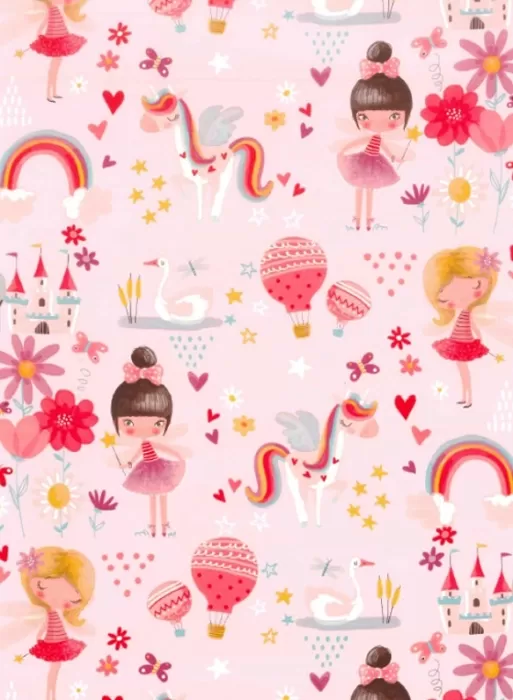Kvalitní světle růžový balicí papír na dárky s motivem víl, květin a jednorožců a mnoho dalšího.Rozměr: 5 x 0,70 m