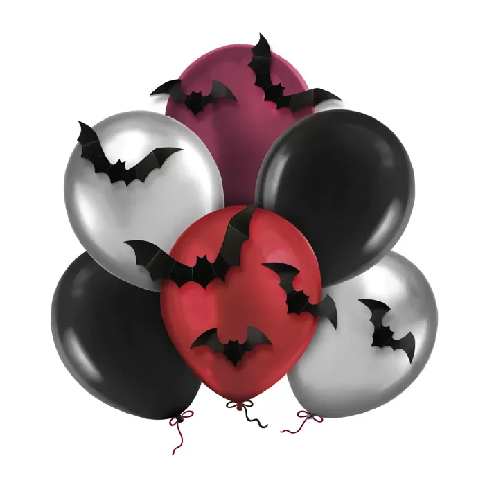 Latexové balonky 3D netopýři jsou zábavnou a efektní dekorací na Halloween, strašidelnou párty nebo tematické akce. Sada určená pro DIY tvoření umožní rychle vykouzlit trojrozměrné netopýry pomocí balónků, papírových křídel a jednoduchých rekvizit. Hotové dekorace lze zavěsit u stropu, připevnit ke stěně nebo je použít jako součást foto koutku. Ideální způsob jak zapojit děti i dospělé do příprav výzdoby a dodat vaší párty originální rukopis. Jednoduchý návod na sestavení:1. Nafoukněte latexový balonek a pevně ho zavázejte.2. Netopýry přilepte k balonku oboustrannoými lepicímí kolečky. Velikost: 30 cmBalení: 6 ks - 2x stříbrný balonek, 2x černý balonek, 1x červený balonek, 1x burgundy balonek, oboustranné lepící kolečka, 8x papíroví netopýři Balonky je vhodné foukat heliem i vzduchem.