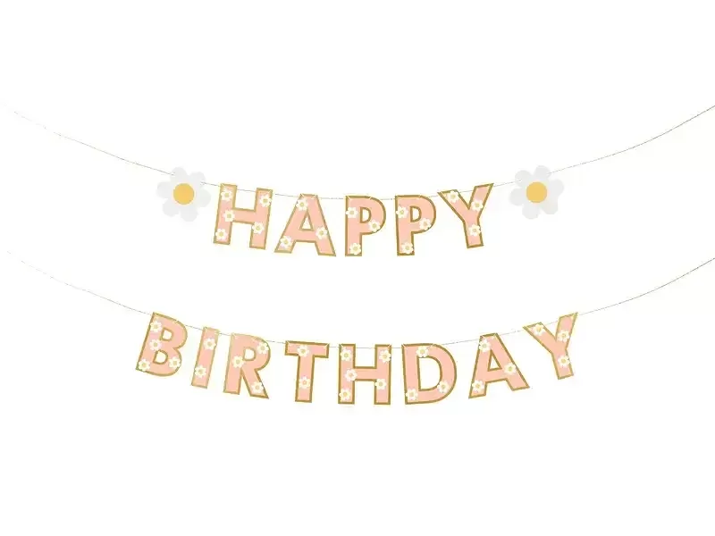 Tento narozeninový banner Happy Birthday je stylovou dekorací pro každou oslavu. Nápis je vyveden v jemně růžovém písmu, doplněný zlatým lemem, který dodává luxusní a slavnostní vzhled. Na krajích banneru se nachází roztomilé kopretiny, které podtrhují veselou, hravou a elegantní atmosféru oslavy. Banner je závěsný, snadno se instaluje a jeho délka 2 metry umožňuje ozdobit stěny, dveře, nad stolem s dortem nebo fotokoutek. Perfektní doplněk k narozeninové výzdobě pro děti i dospělé, který ladí s girlandami, balónky a dalšími dekoracemi. Skvělá volba pro ty, kdo chtějí oslavu udělat výjimečnou, barevnou a přitom elegantní.