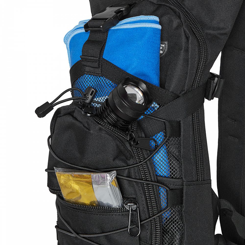 Hlavní komora batohu je opatřena přepážkou, v horní části se nachází 2 karabiny pro zavěšení hydrovaku (není součástí dodávky). Hadičku hydrovaku lze vyvést průvlaky na pravé i na levé straně pod ramenními panely. Na hlavní komoře se nacházejí další úložné prostory a to velká síťovaná kapsa s popruhem a přezkou - menší otevřená, síťovaná kapsa - 2. komora na zip - kapsa na zip (například pro mobilní telefon a peněženku) a gumová šňůra s brzdičkou, pod kterou lze přenášet například cyklistickou helmu, nebo karimatku. Po stranách batohu se nachází kompresní popruhy, které stahují hlavní komoru a obě síťované kapsy. Na horní straně je robustní ucho pro pohodlné přenášení batohu v ruce. Zadní strana a ramenní popruhy jsou polyesterové bez polstrování. Na popruzích je gumové poutko k provlečení hadičky hydrovaku a hrudní popruh, ten je výškově a délkově nastavitelný. Bederní popruh s robustní přezkou má šířku 3,5 centimetru.