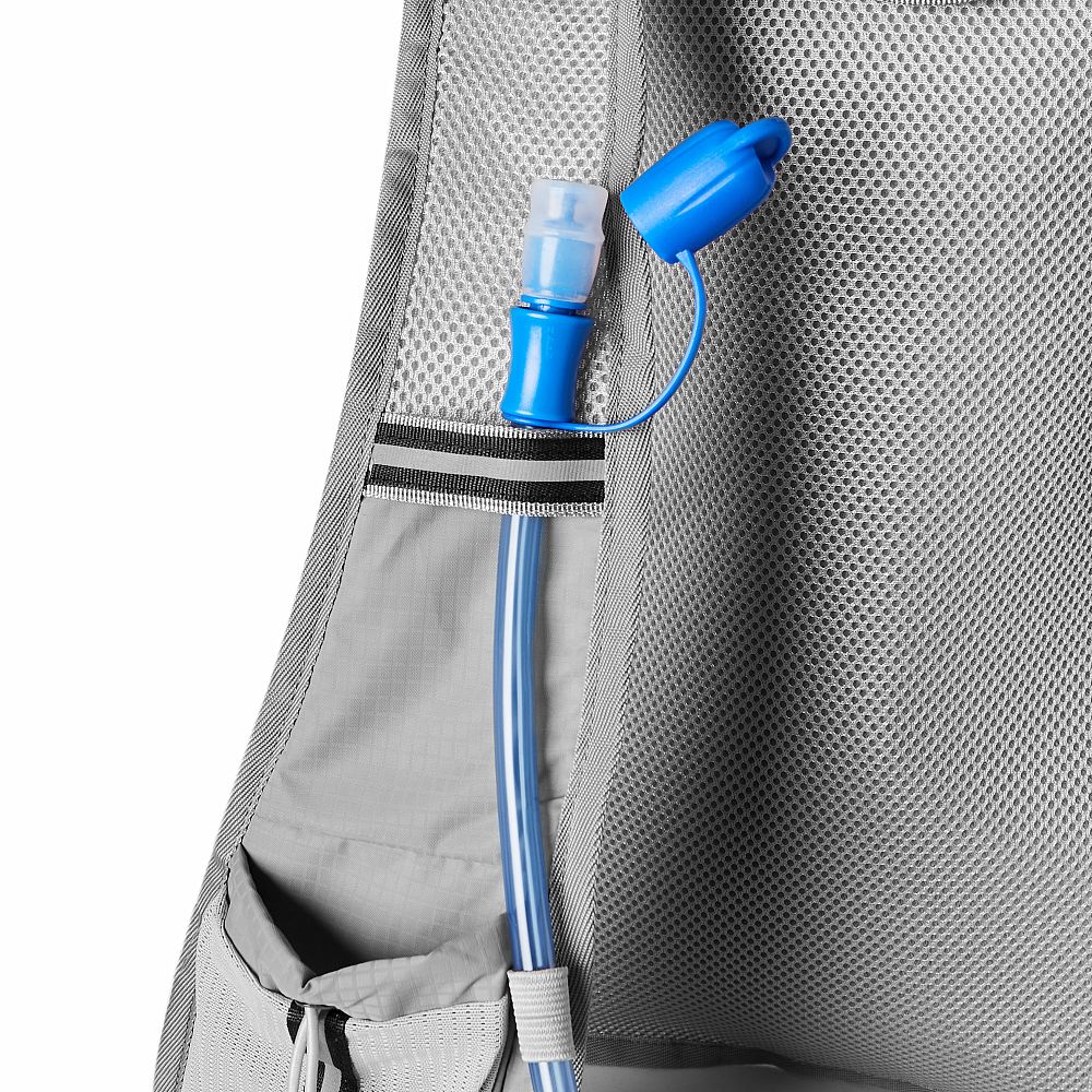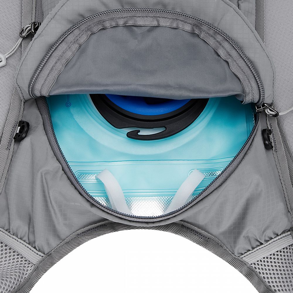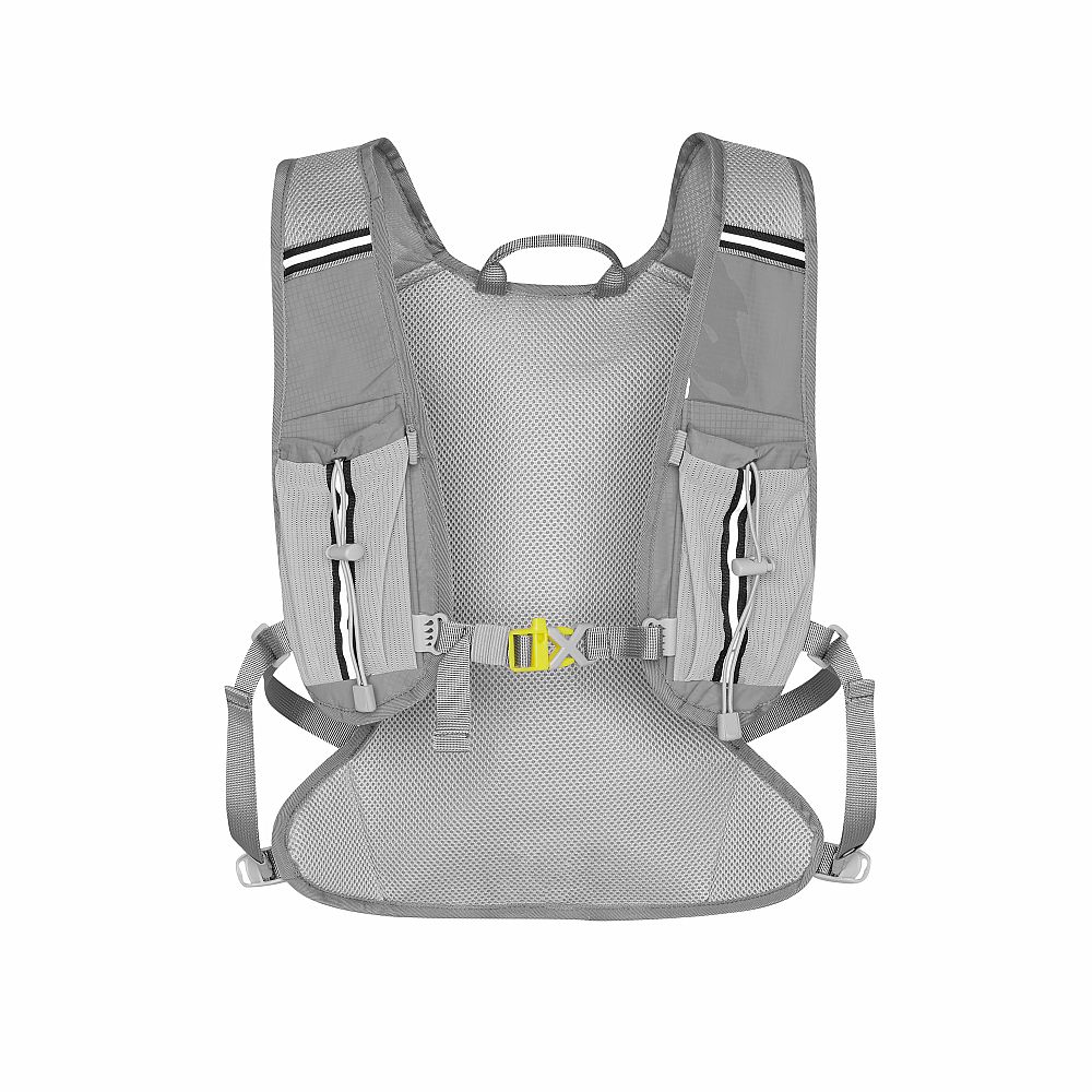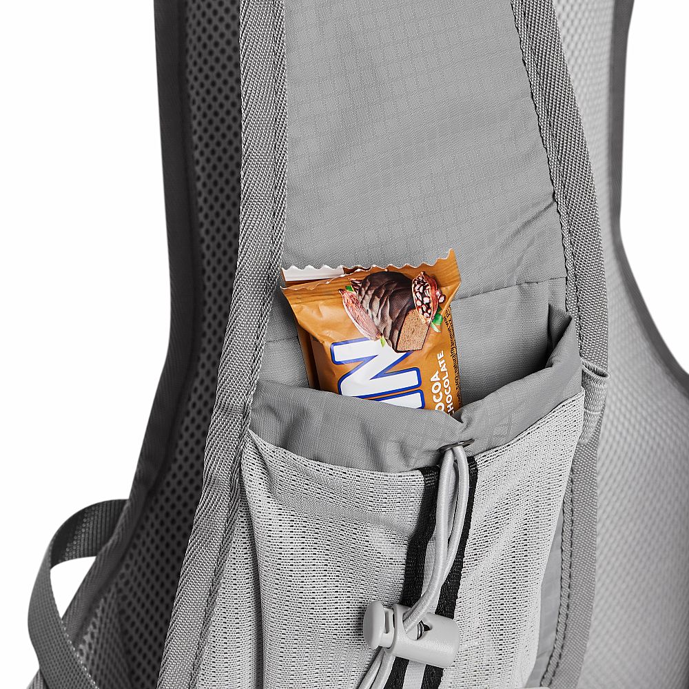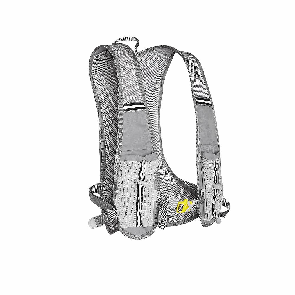 Hlavní komora batohu je opatřena přepážkou, v horní části se nachází 2 suché zipy pro zavěšení hydrovaku (není součástí dodávky). Zadní strana hlavní komory je opatřena hliníkovou fólií, která slouží jako izolace mezi hydrovakem a zády, takže nápoj se nebude ohřívat teplem od zad. Hadičku hydrovaku lze vyvést průvlaky na pravé i na levé straně pod ramenními panely. Přední strana batohu je opatřena gumovým lankem s brzdičkou, pod které lze uložit například karimatku. Níže nalezneme kapsu, ve které se skrývá síťka, kterou lze vytáhnout a pomocí karabinek připnout ke stranám batohu, síťka následně vytvoří kapsu, co které můžeme uložit například cyklistickou helmu, ešus apod.. Pod kapsou je reflexní panel, ke kterému si můžeme připnout další vybavení. Na pravé straně se skrývá další kapsa na zip, která je ideální pro telefon, peněženku, nebo například klíče. Na horní straně batohu je poutko pro snadné přenášení batohu v ruce. Záda a ramenní popruhy jsou vyrobeny ze síťoviny doplněné o prodyšnou pěnu, která zvyšuje prodyšnost panelu a záda se budou méně potit. Ramenní popruhy jsou opatřeny reflexními řemínky pro protažení hadičky od hydrovaku a kapsami ze síťoviny. Na levém popruhu se navíc nachází kapsička s průhlednou čelní stranou, do které lze uložit například kartičku pro případ ztráty, startovní číslo a podobně. Ramenní popruhy jsou spojeny hrudním pásem, který lze výškově nastavit. Popruh je spojen plastovou přezkou s píšťalkou.