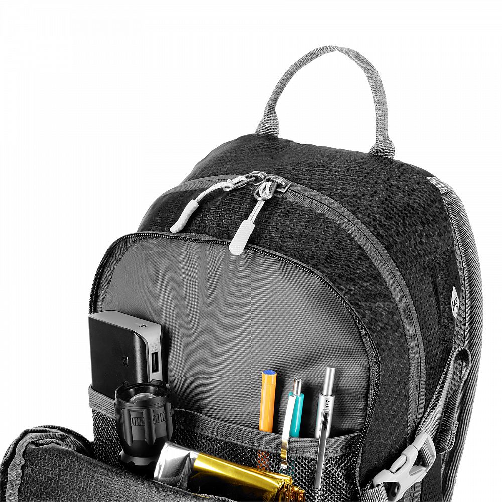 Na přezce hrudního popruhu je umístěna integrovaná záchranná píšťalka pro větší bezpečnost v nouzových situacích. Batoh dále nabízí další panel s úchyty na různé příslušenství, dvě boční síťované kapsy a kapsy na zip v bederním pásu, ideální pro uložení telefonu nebo jiných drobností.