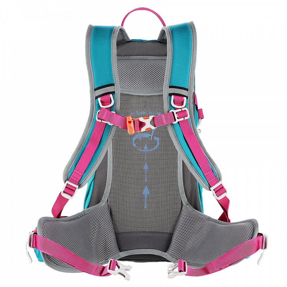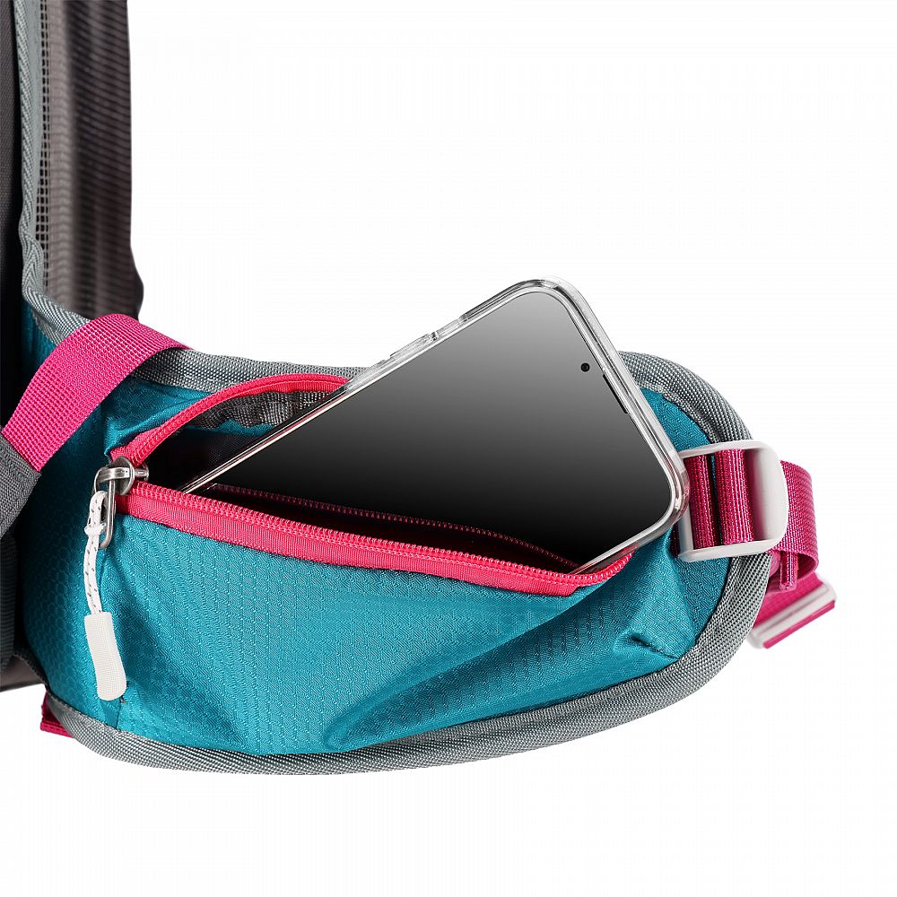 Na přezce hrudního popruhu je umístěna integrovaná záchranná píšťalka pro větší bezpečnost v nouzových situacích. Batoh dále nabízí další panel s úchyty na různé příslušenství, dvě boční síťované kapsy a kapsy na zip v bederním pásu, ideální pro uložení telefonu nebo jiných drobností.