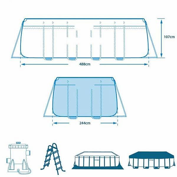 Bazén INTEX Prism Frame 488 x 244 x 107 cm je zahradní bazén s kovovým rámem pro povrchovou montáž. Včetně kartušové filtrace 3.785 l/hod a příslušenství. Jednoduše smontovatelný, robustní bazén s dlouhou životností.