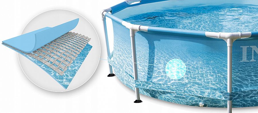 Dno a boční stěny jsou vyrobeny ze 3 vrstev materiálu Super-Tough. Tento velice pevný materiál se skládá a z polyesterové podkladové tkaniny se silným, oboustranně nalaminovaným PVC. Super-Tough je odolný proti benzínu, oleji a obzvlášť odolný proti oděru, nárazu a slunečnímu záření. Foto potisk na vnější straně a dně bazénu.