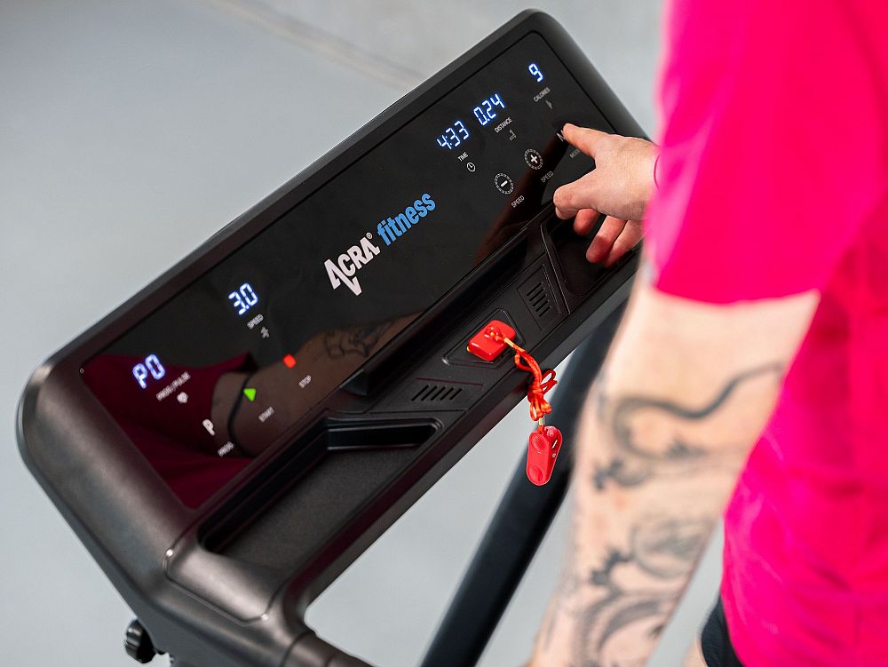 - Bezpečný trénink: Krátký držák poskytuje stabilitu a bezpečnost při cvičení. Bezpečnostní klíč navíc umožňuje okamžité zastavení pásu v případě potřeby.