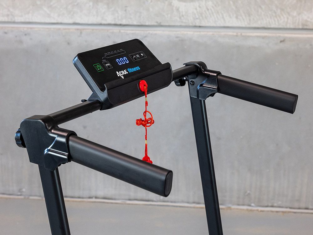 - Bezpečný trénink: Krátký držák poskytuje stabilitu a bezpečnost při cvičení. Bezpečnostní klíč navíc umožňuje okamžité zastavení pásu v případě potřeby.