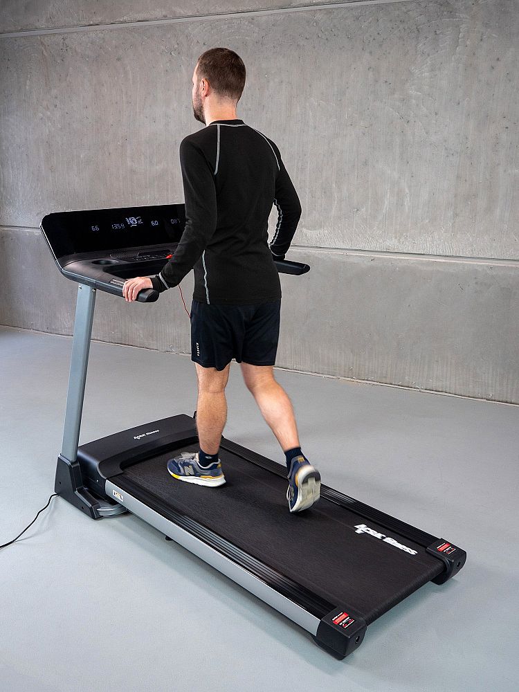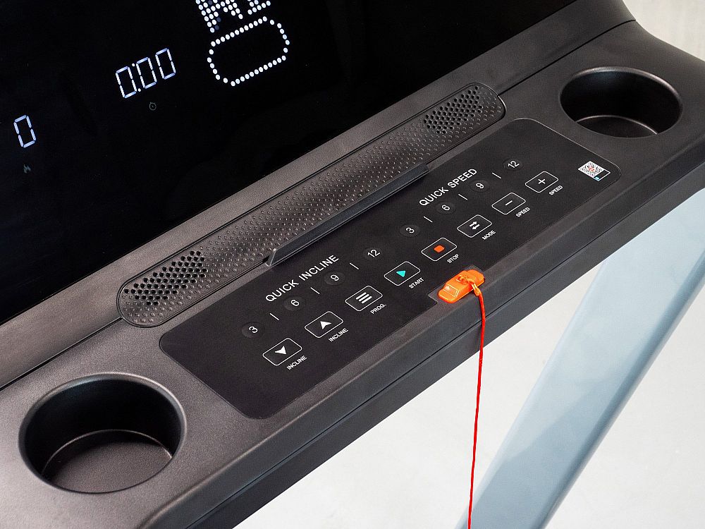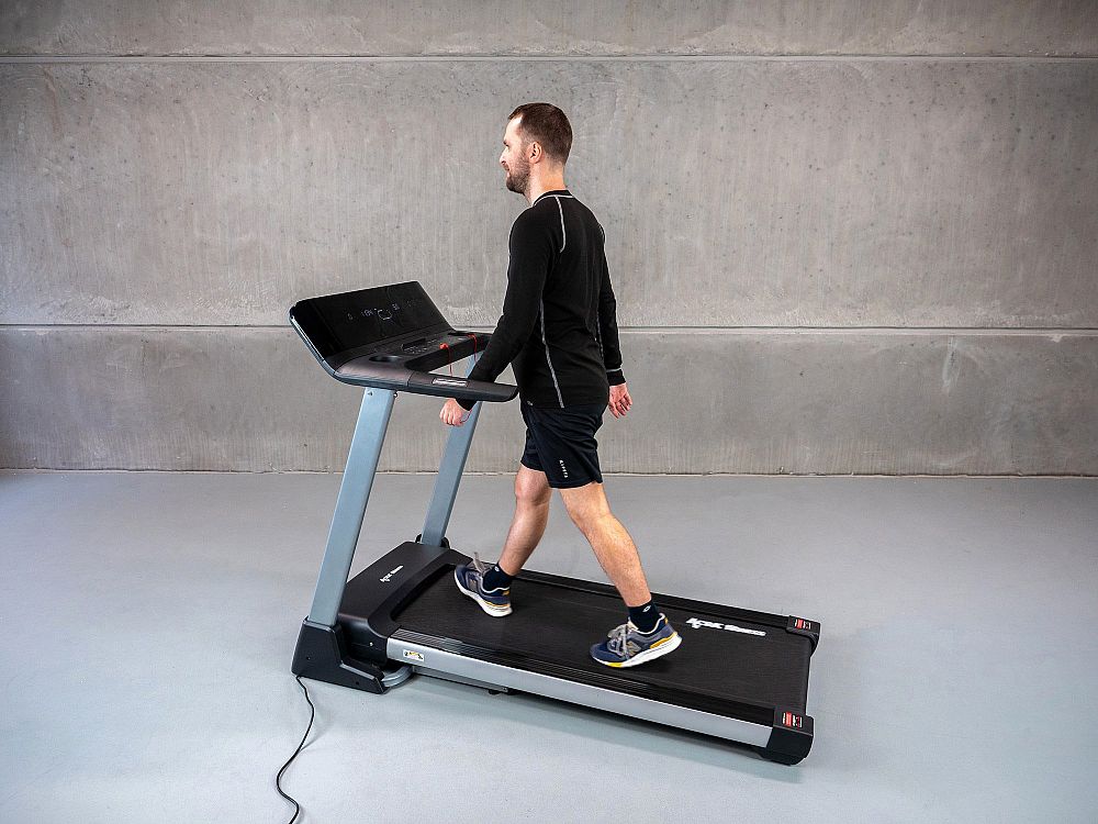 Pás také disponuje bezpečnostní rychlobrzdou, která umožňuje okamžité zastavení v případě potřeby. Sklon pásu lze elektricky nastavit v rozmezí 0-15 % přímo z obrazovky, což umožňuje plynulou změnu během běhu.