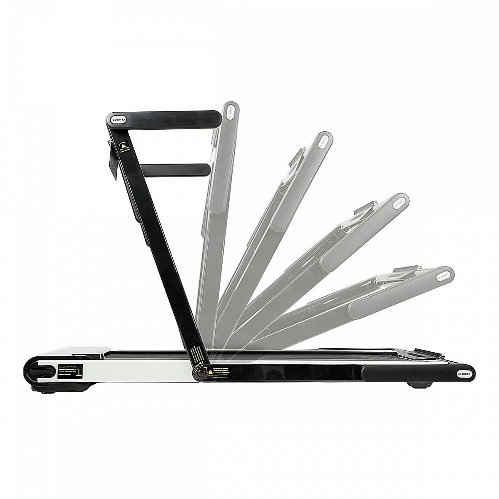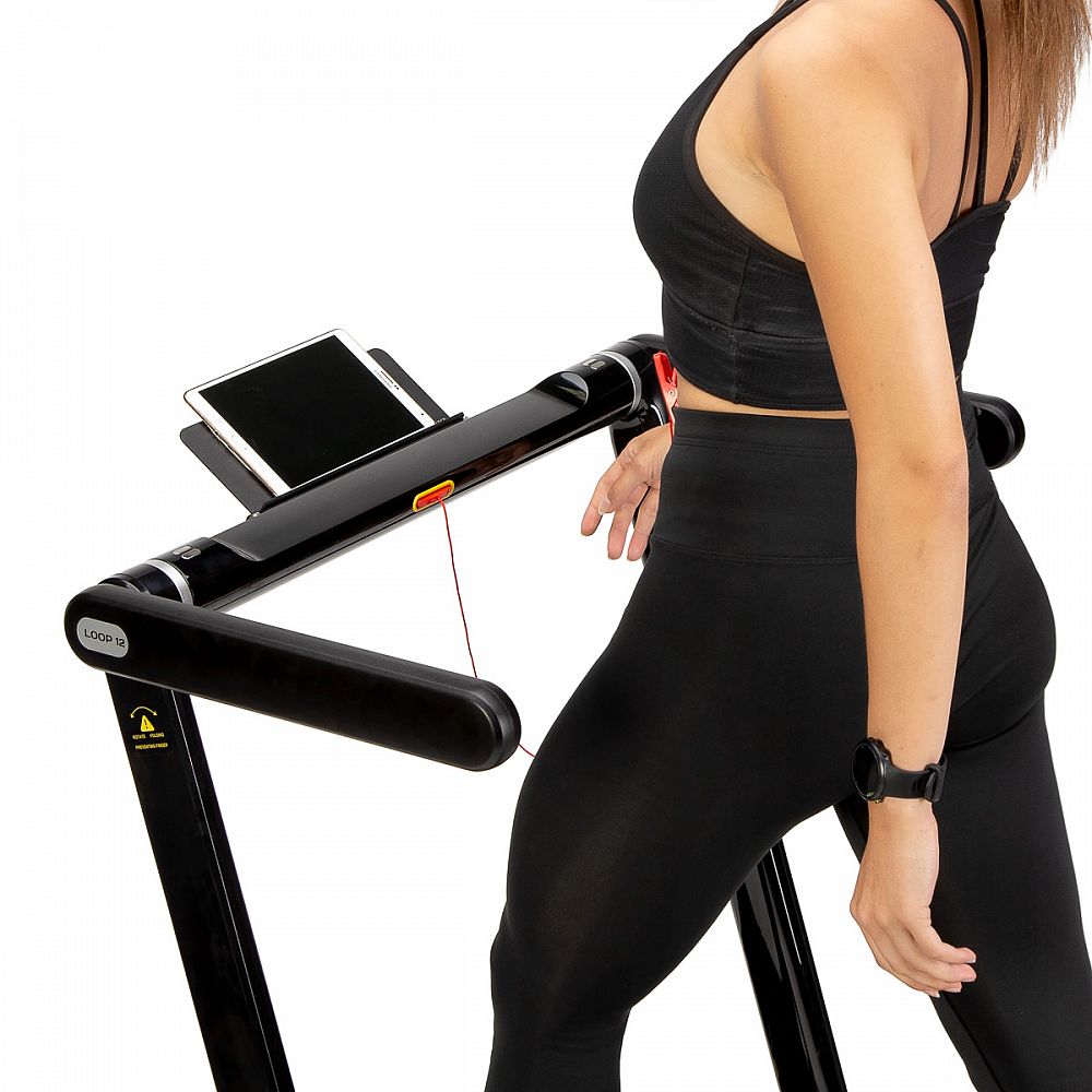 Bez nasazeného pultu se z trenažéru LOOP12 stává plnohodnotný běžecký pás s maximální rychlostí 12 km/h a výkonem 2,5 HP. Běžecká plocha o rozměrech 125 x 45 cm je na 6 místech odpružena pomocí silikagelových silentbloků, které snižují zatěžování kloubů při běhu. Konzole jde snadno sklopit k zadní hraně trenažéru a po sklopení získáme rozměr 158 x 77 x 14 cm a trenažér se tak vejde za skříň, nebo pod postel. Přesouvání modelu LOOP12 navíc ulehčují 2 páry koleček. První pár se nachází na spodní hraně a po zvednutí zadní části pásu umožňují pohyb vpřed a vzad. Druhý pár koleček se nachází na čele trenažéru a po jeho zvednutí do kolmé pozice umožňují pohyb do stran.