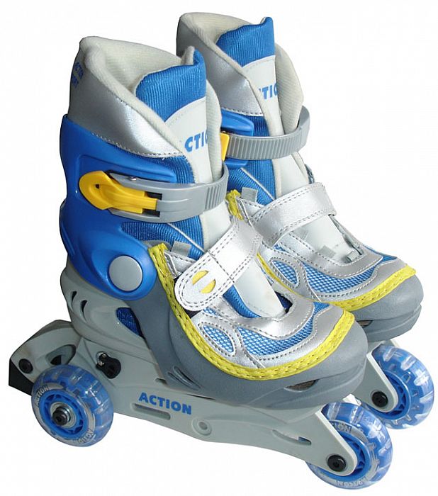 Brusle Triskate - Kolečkové brusle roztahovací - tříkolečkové, 4 velikosti v jedné, 2 přezky, PU kolečka - transparentní, ložiska 608 Z, vel. M. Vnitřní stélka vložky, při nastavené velikosti 30, činí 18,5 cm. K dispozici již pouze v barvě MODROŠEDÉ Action, viz foto. Brusle mají velikost 30 - 33. Brusle lze použít jako in-line brusle i jako typ 1 + 2, kdy dvě zadní kolečka umožňují větší stabilitu pro začínající bruslaře. K dispozici provedení viz foto Action.