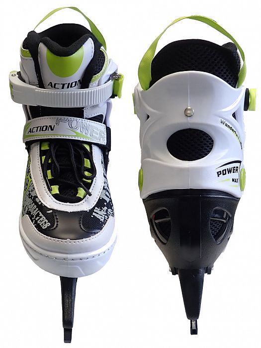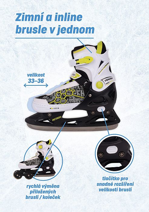 Chlapecké brusle s vyměnitelným podvozkem 2 v 1 představují univerzální řadu bruslí k celoročnímu použití. Přiložené dva podvozky umožňují univerzálně měnit kolečkové brusle se zimními pruslemi - měkká šněrovací bota s přezkou a stahovacím páskem na suchý zip, vnitřní výplň s "pamětí", ložiska ABEC - 5, zpevněný plastový podvozek, PU vrstvená kolečka 70 x 24 mm v transparentní barvě, vel. 33 - 36 = 20,5 - 22,5 cm. Zimní nůž na bruslení má plastový základ z ABS plastu s kovovým břitem ze zušlechtěné oceli. Kvalitní podvozek, ložiska a kolečka, případně zimní nůž umožňují komfortní celoroční bruslení. Nosnost bruslí je 80 kg. Výměna je velmi jednoduchá pomocí povolení a vyjmutí nože z držáku a následného utažení těchto šroubů po vložení druhého držáku.Dodavatel: ACRA s.r.o., Brodská 161, Semily, 51301, 420481389087, obchod@acra.cz