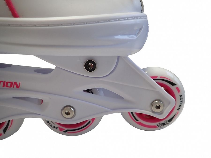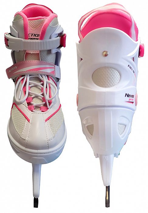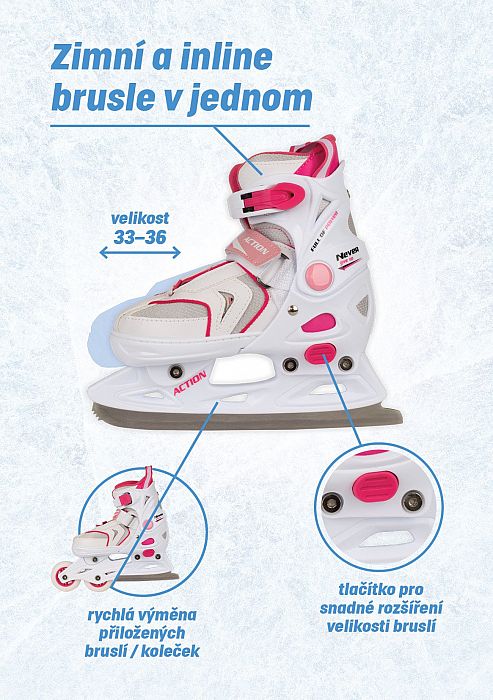Přiložené dva podvozky umožňují univerzálně měnit kolečkové brusle se zimními bruslemi - měkká šněrovací bota s přezkou a stahovacím páskem na suchý zip, vnitřní výplň s "pamětí", ložiska ABEC - 5, zpevněný plastový podvozek, PU vrstvená kolečka 70 x 24 mm v transparentní barvě, vel. 33 - 36 = 21 - 22,5 cm.