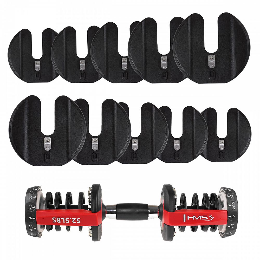 Nastavitelná činka HMS SR52 je skvělým řešením i pro náročnější uživatele. Inovativní systém nastavení zátěže s využitím stojanu a dvou postraních regulátorů je velice jednoduchým a hlavně nenáročným řešením při seřízení potřebné váhy. Nemusíte tedy trávit čas během cvičení zbytečným přehazováním kotoučů. Ergonomická rukojeť a využití těch nejkvalitnějších materiálů je zárukou skvělých tréninkových výsledků. Upozornění: veškerá váha závaží je uváděna v librách (lbs). 1 libra = 0,45 kg