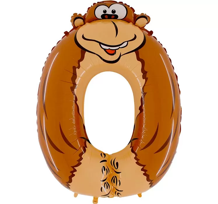 Narozeninové zvířátko je fóliový balónek ve tvaru číslice 0, která představuje veselou opičku.