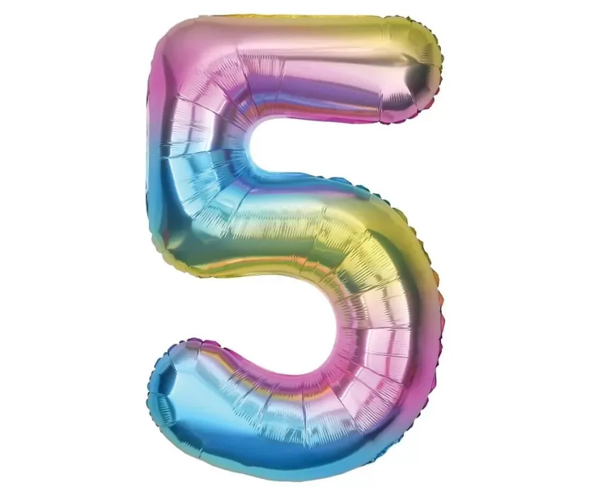Foliová číslice 5 v duhovém stylu. Balonek je vhodný na narozeninové oslavy a párty, kde může ukazovat věk oslavence nebo výročí firmy a další. Lze nafukovat vzduchem i heliem (při nafouknutí heliem létá minimálně 3-5 dní).
