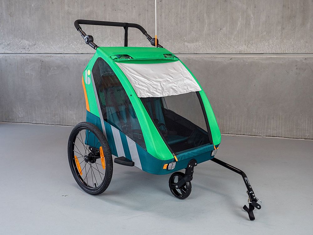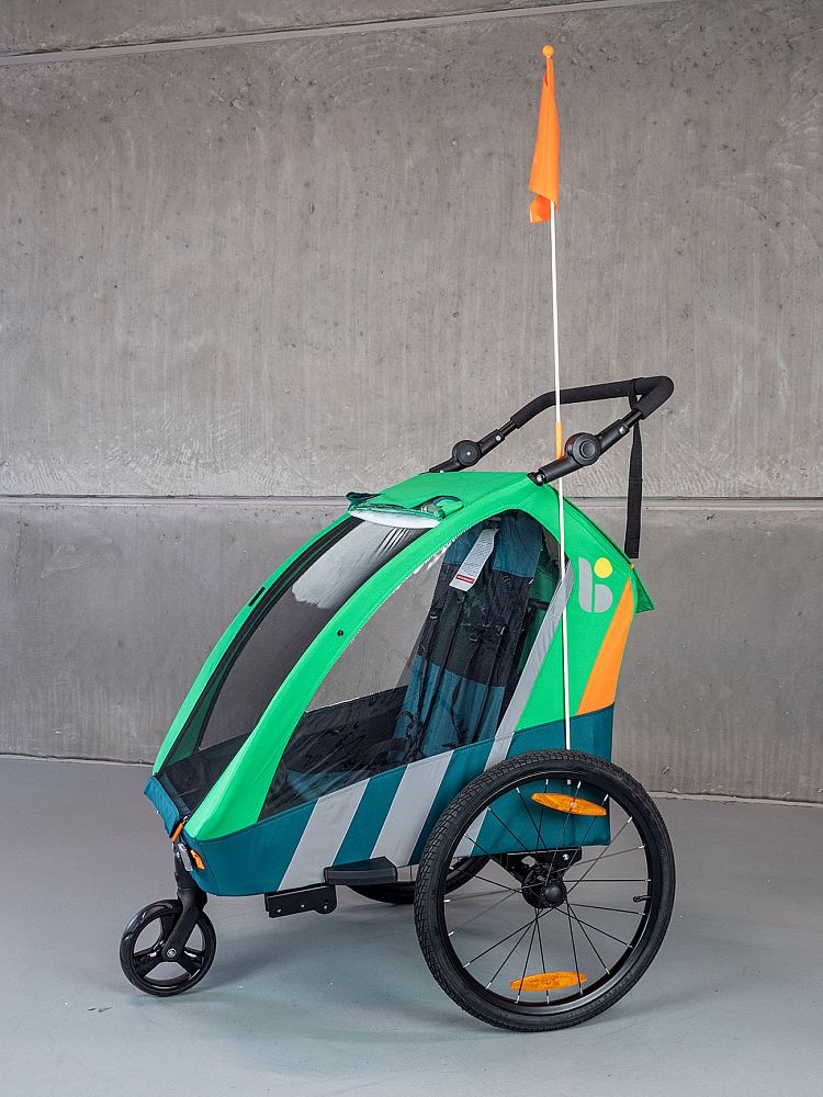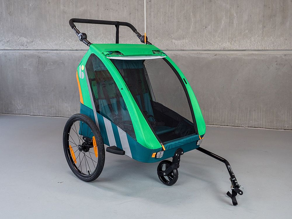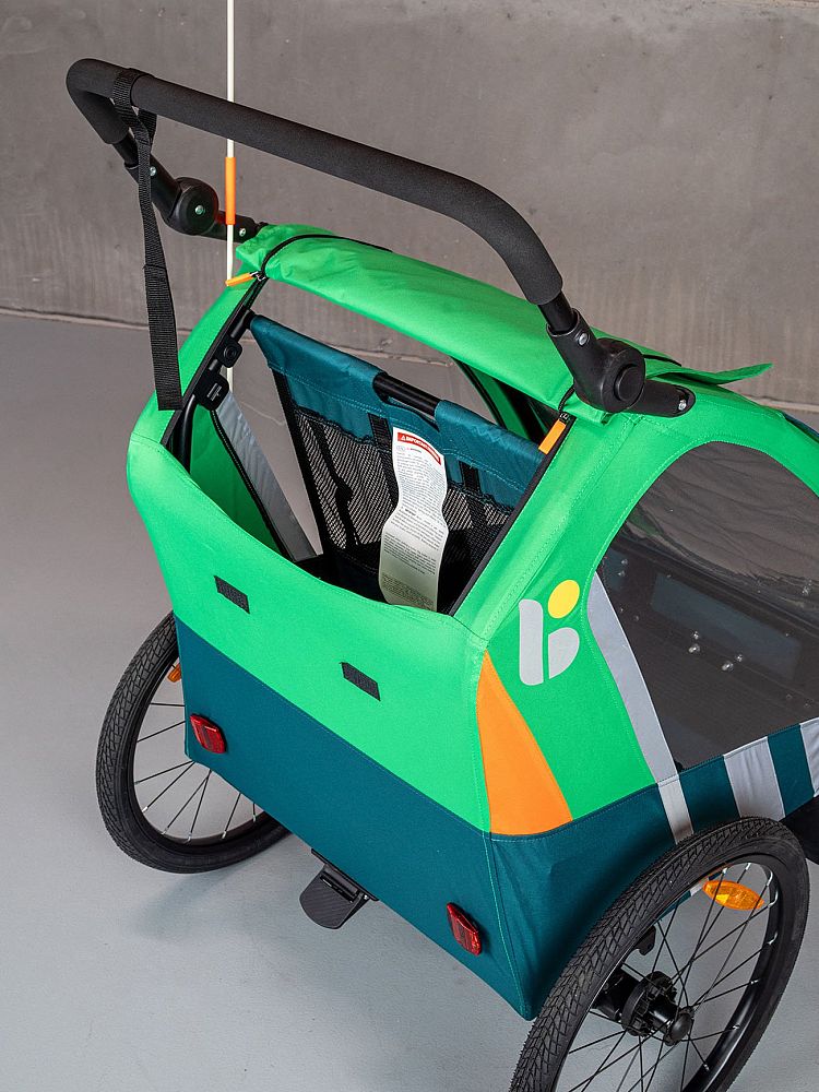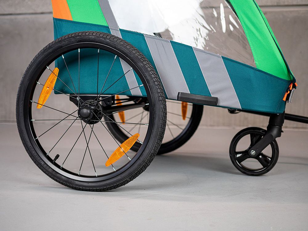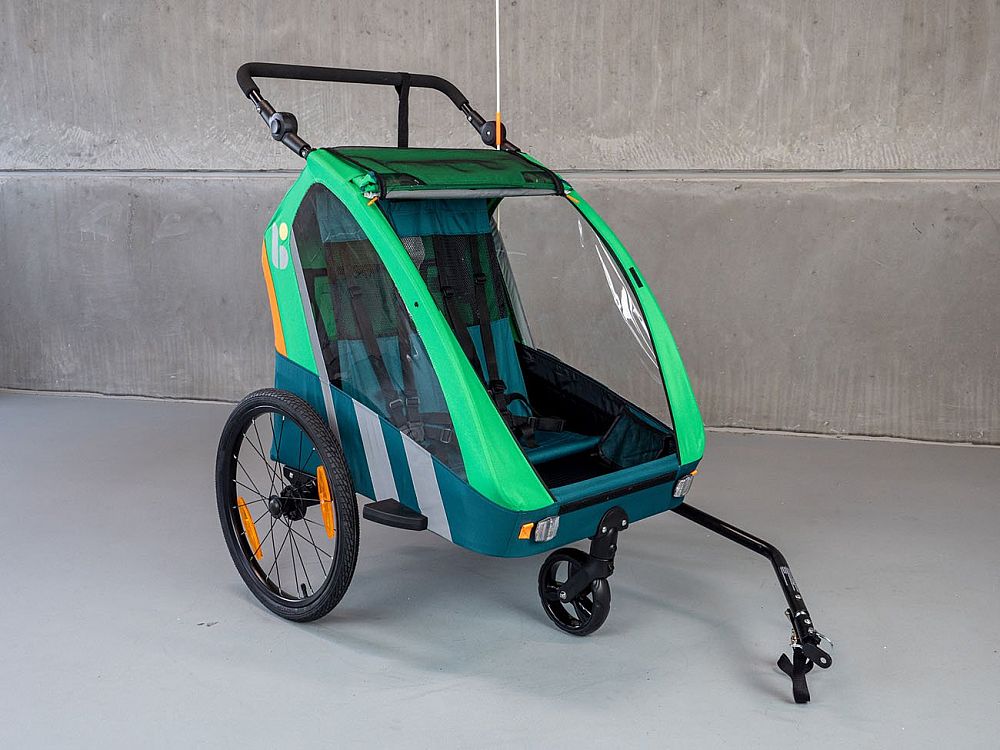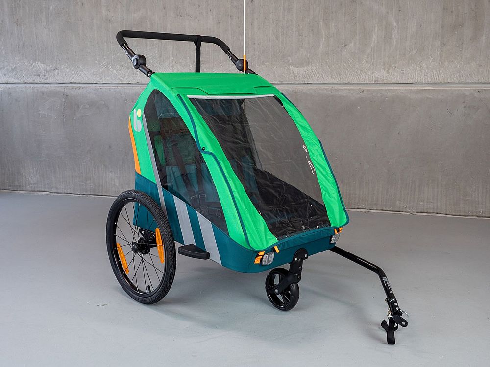 Dětský přívěsný vozík Trailblazer (2v1) za jízdní kolo v kombinaci se sportovním kočárkem pro 2 děti je kvalitní model s veškerou certifikací pro provoz na pozemních komunikacích. Základem je dvoukolový vozík s tažnou ojí, kterou je možno nahradit třetím otočným kolečkem a tím vozík snadno a rychle změnit na sportovní kočárek pro dvě děti. Vozík je vyrobený z nepromokavého pevného materiálu (PES 600D oxford) a v přední části je vybavený průhledným PVC oknem, dvě menší okna jsou i v boční části vozíku (kočárku), aby dítě (děti) mělo výhled z vozíku do okolí. Dále je vozík vybavený stahovací sluneční střechou a ochrannou síťovinou proti hmyzu pro použití v příznivém počasí. Vozík má dvě sedačky s 5-bodovými bezpečnostními pásy spojovanými jednou přezkou upevňující se na hrudníku dítěte. Přístup do vozíku je zepředu a je velmi pohodlný pro uložení dětí. Vozík má nastavitelnou tuhost odpružení, je vybavený bezpečnostní parkovací brzdou se snadným ovládáním. Vozík je dále vybavený reflexními pruhy po straných, odrazkami na přední i zadní části a také výstražnou oranžovou vlajkou 150 cm vysokou. Vozík je opatřený dvěma stabilními 20″ koly (+ jedním otočným přídavným kolem uloženým ve zvláštní kapse na vozíku). Dále má vozík velký uložní prostor v zadní části. Pevná a lehké konstrukce se snadnou možností přestavění vozíku na kočárek dělá z vozíku atraktivní prostředek umožňující sportovně založeným rodičům pohyb venku, a to i s malými dětmi. Vozík se upíná na osu zadního kola. Jako pojistka proti odpojení vozíku je součástí vybavení popruh s karabinou, která se upíná na rám kola a slouží pro zajištění vozíku proti odpojení i při uvolnění upínací matice.