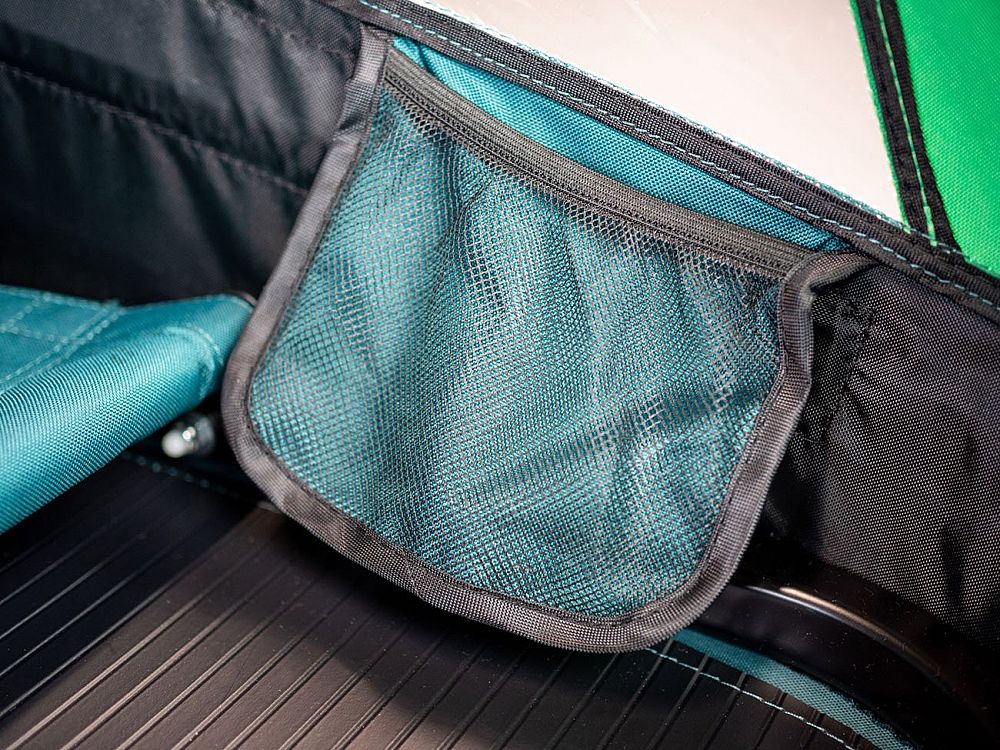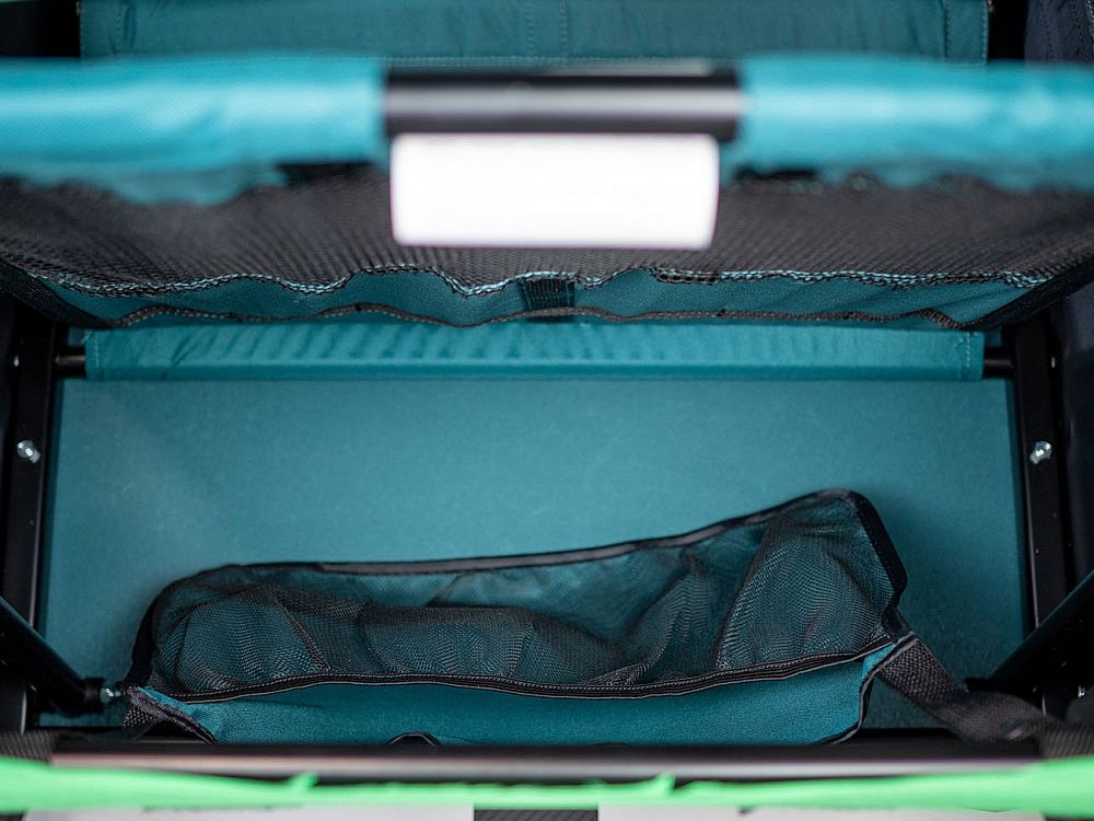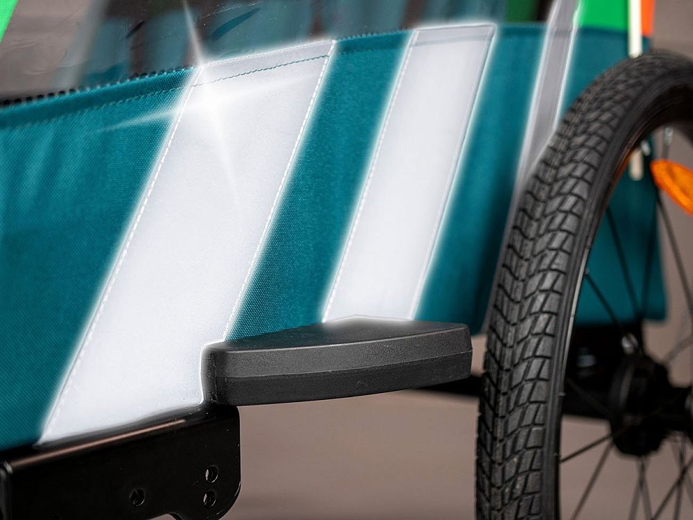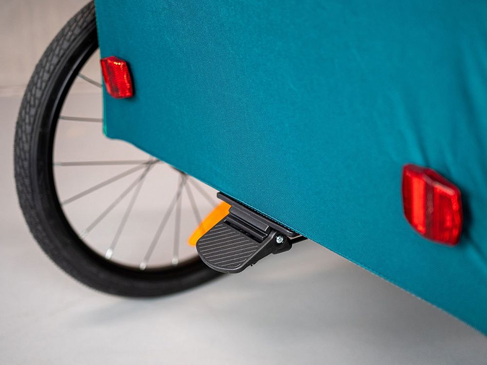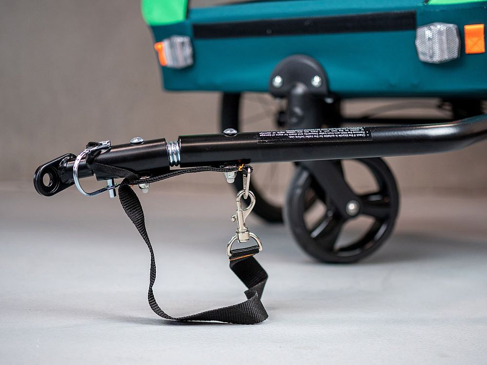 - snadné připevnění k zadní ose jízdního kola, zajištění upínacím popruhem s karabinou proti odpojení vozíku za jízdy