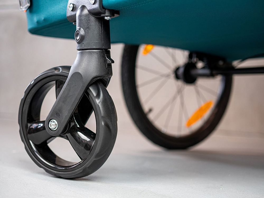 - 20″ kola – dvě pevná, třetí otočné pro přeměnu vozíku na kočárek (souběžně s tím se snadno zasune do rámu vozíku tažná oj, aby nepřekážela)