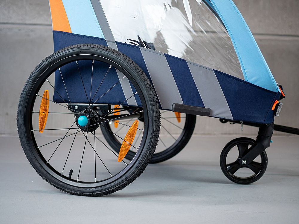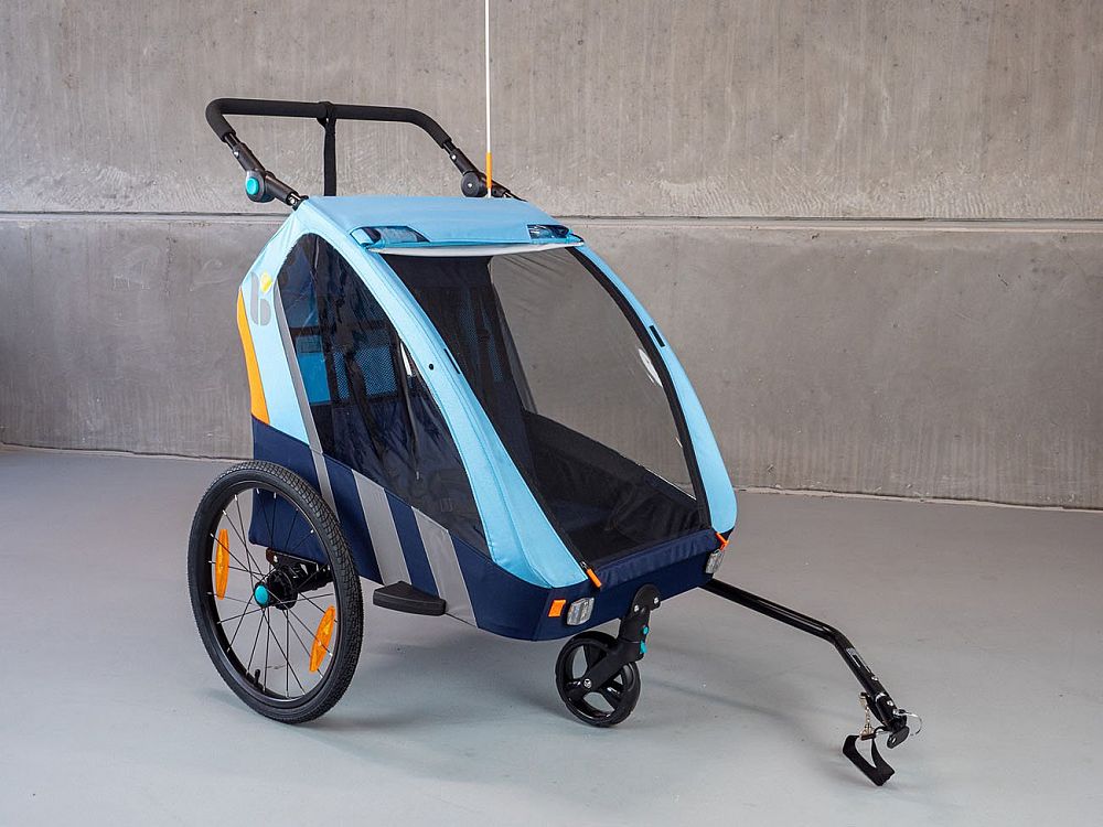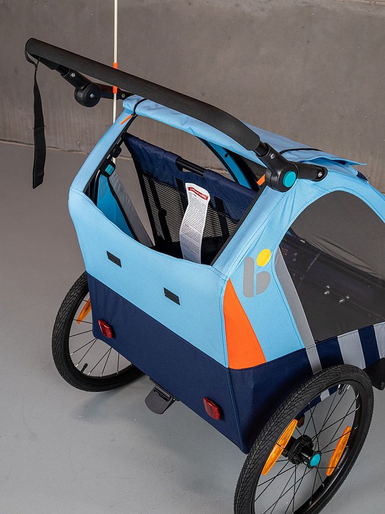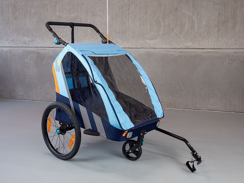Dětský přívěsný vozík Trailblazer (2v1) za jízdní kolo v kombinaci se sportovním kočárkem pro 2 děti je kvalitní model s veškerou certifikací pro provoz na pozemních komunikacích. Základem je dvoukolový vozík s tažnou ojí, kterou je možno nahradit třetím otočným kolečkem a tím vozík snadno a rychle změnit na sportovní kočárek pro dvě děti. Vozík je vyrobený z nepromokavého pevného materiálu (PES 600D oxford) a v přední části je vybavený průhledným PVC oknem, dvě menší okna jsou i v boční části vozíku (kočárku), aby dítě (děti) mělo výhled z vozíku do okolí. Dále je vozík vybavený stahovací sluneční střechou a ochrannou síťovinou proti hmyzu pro použití v příznivém počasí. Vozík má dvě sedačky s 5-bodovými bezpečnostními pásy spojovanými jednou přezkou upevňující se na hrudníku dítěte. Přístup do vozíku je zepředu a je velmi pohodlný pro uložení dětí. Vozík má nastavitelnou tuhost odpružení, je vybavený bezpečnostní parkovací brzdou se snadným ovládáním. Vozík je dále vybavený reflexními pruhy po straných, odrazkami na přední i zadní části a také výstražnou oranžovou vlajkou umístěnou na pružném prutu o délce 150 cm. Vozík je opatřený dvěma stabilními 20″ koly (+ jedním otočným přídavným kolem uloženým ve zvláštní kapse na vozíku). Dále má vozík velký uložní prostor v zadní části. Pevná a lehké konstrukce se snadnou možností přestavění vozíku na kočárek dělá z vozíku atraktivní prostředek umožňující sportovně založeným rodičům pohyb venku, a to i s malými dětmi. Vozík se upíná na osu zadního kola. Jako pojistka proti odpojení vozíku je součástí vybavení popruh s karabinou, která se upíná na rám kola a slouží pro zajištění vozíku proti odpojení i při uvolnění upínací matice.
