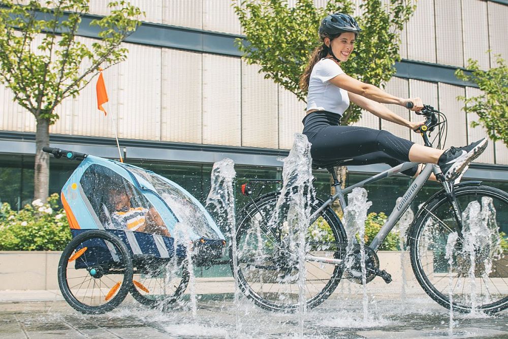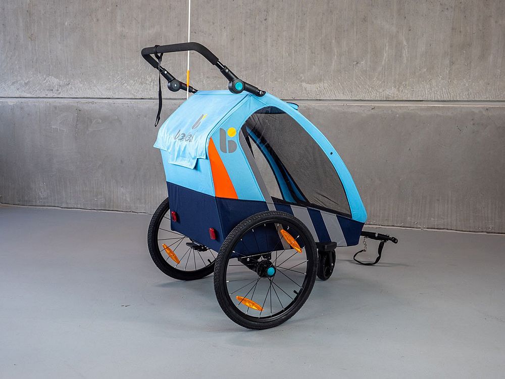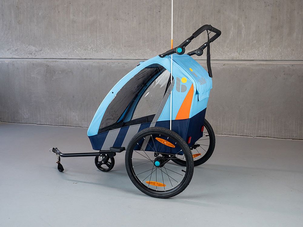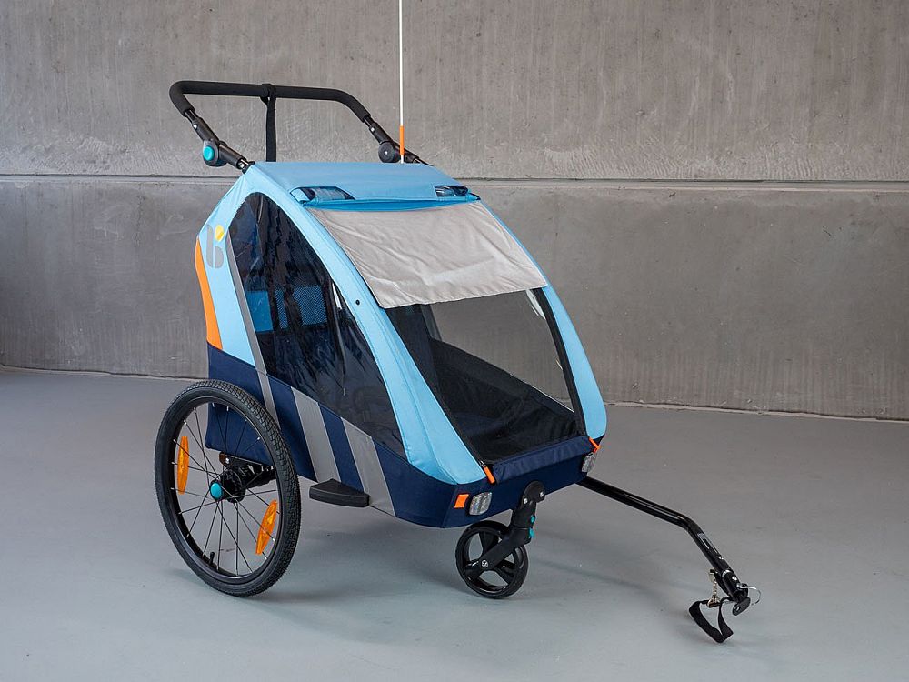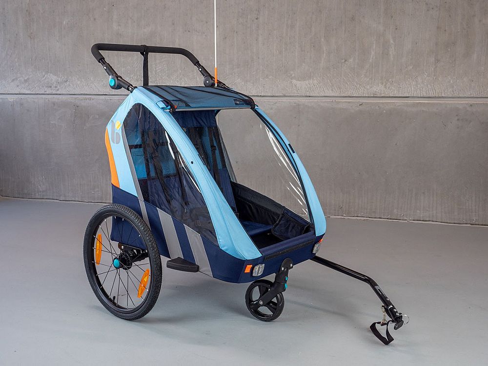 Dětský přívěsný vozík Trailblazer (2v1) za jízdní kolo v kombinaci se sportovním kočárkem pro 2 děti je kvalitní model s veškerou certifikací pro provoz na pozemních komunikacích. Základem je dvoukolový vozík s tažnou ojí, kterou je možno nahradit třetím otočným kolečkem a tím vozík snadno a rychle změnit na sportovní kočárek pro dvě děti. Vozík je vyrobený z nepromokavého pevného materiálu (PES 600D oxford) a v přední části je vybavený průhledným PVC oknem, dvě menší okna jsou i v boční části vozíku (kočárku), aby dítě (děti) mělo výhled z vozíku do okolí. Dále je vozík vybavený stahovací sluneční střechou a ochrannou síťovinou proti hmyzu pro použití v příznivém počasí. Vozík má dvě sedačky s 5-bodovými bezpečnostními pásy spojovanými jednou přezkou upevňující se na hrudníku dítěte. Přístup do vozíku je zepředu a je velmi pohodlný pro uložení dětí. Vozík má nastavitelnou tuhost odpružení, je vybavený bezpečnostní parkovací brzdou se snadným ovládáním. Vozík je dále vybavený reflexními pruhy po straných, odrazkami na přední i zadní části a také výstražnou oranžovou vlajkou umístěnou na pružném prutu o délce 150 cm. Vozík je opatřený dvěma stabilními 20″ koly (+ jedním otočným přídavným kolem uloženým ve zvláštní kapse na vozíku). Dále má vozík velký uložní prostor v zadní části. Pevná a lehké konstrukce se snadnou možností přestavění vozíku na kočárek dělá z vozíku atraktivní prostředek umožňující sportovně založeným rodičům pohyb venku, a to i s malými dětmi. Vozík se upíná na osu zadního kola. Jako pojistka proti odpojení vozíku je součástí vybavení popruh s karabinou, která se upíná na rám kola a slouží pro zajištění vozíku proti odpojení i při uvolnění upínací matice.