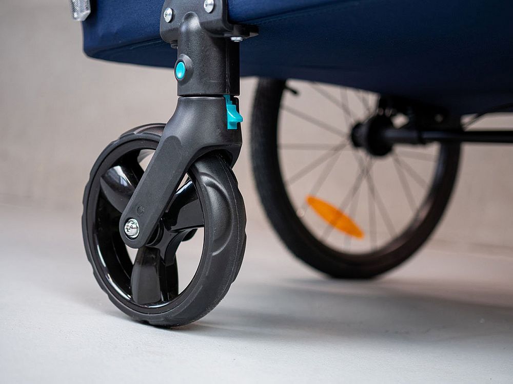 - 20″ kola – dvě pevná, třetí otočné pro přeměnu vozíku na kočárek (souběžně s tím se snadno zasune do rámu vozíku tažná oj, aby nepřekážela)