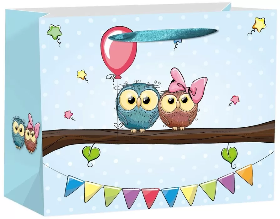 Kvalitní, papírová, dárková taška s motivem sovy na větvi.