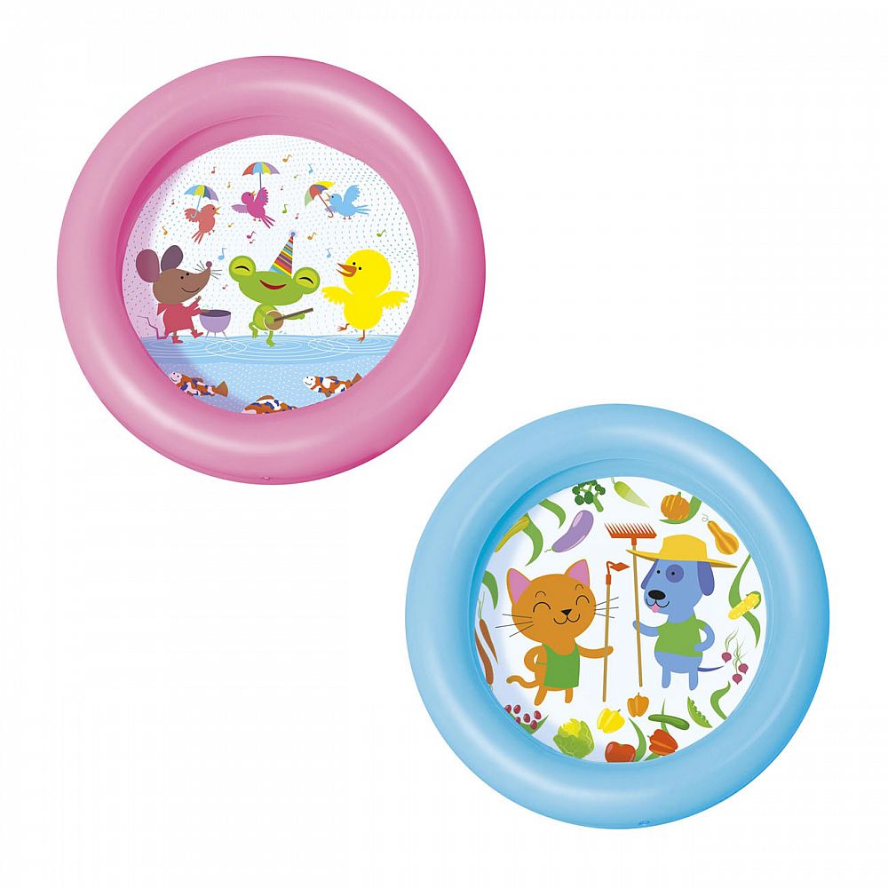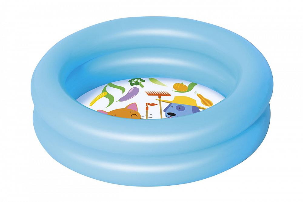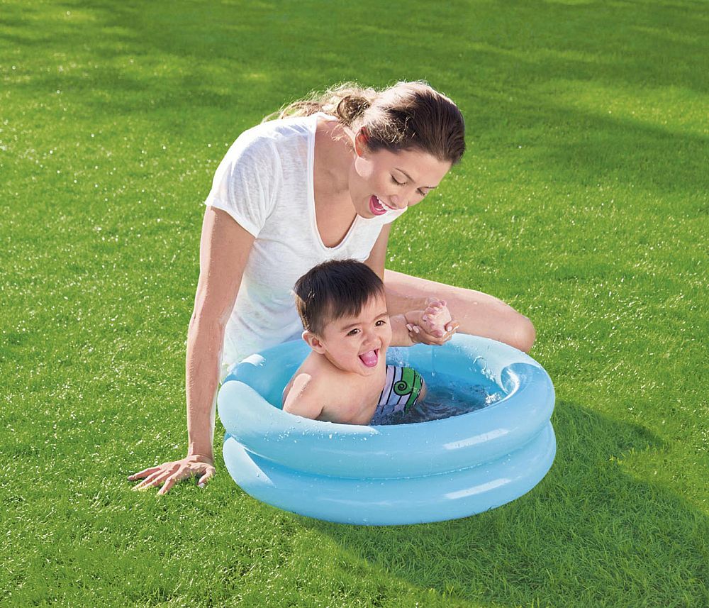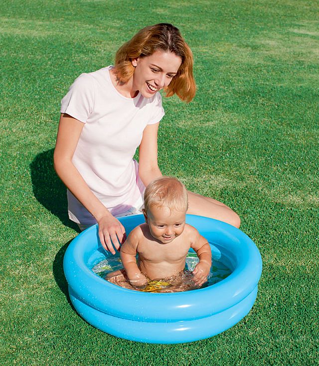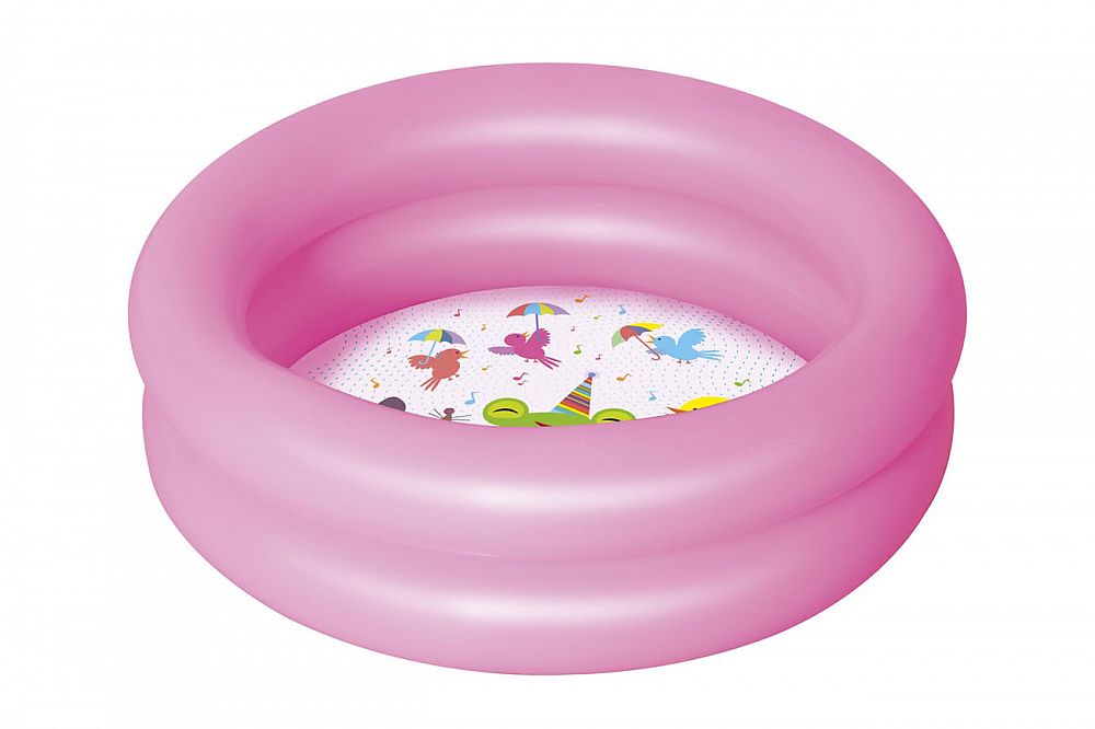 Nafukovací bazén malý dvoukomorový, 61 x 15 cm, vhodné pro děti do tří let, kapacita vody (75%) 21 l. K dispozici jsou dvě barvy – modrá, růžová + potištěné dno. Specifikaci barvy, je nutné uvést v objednávce.