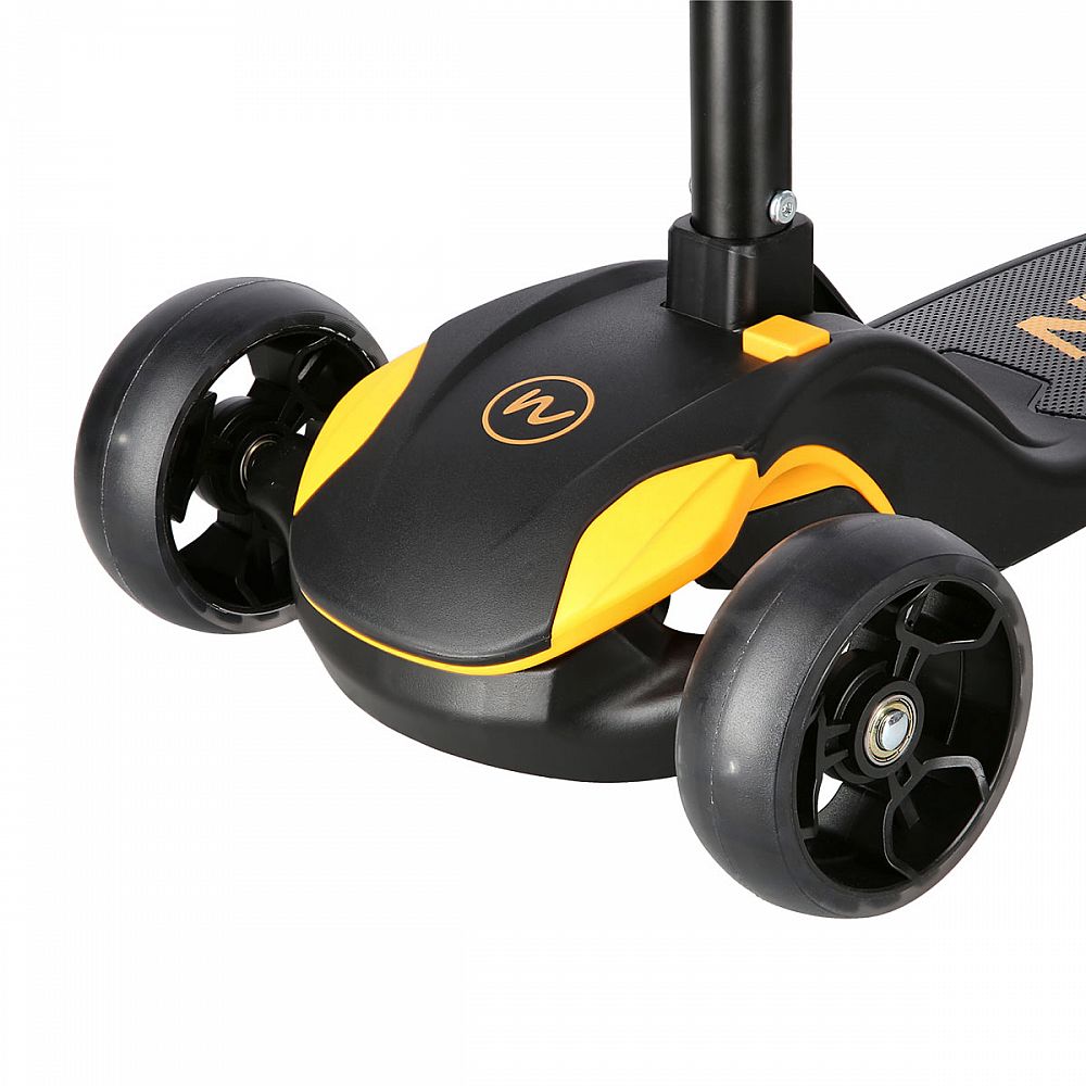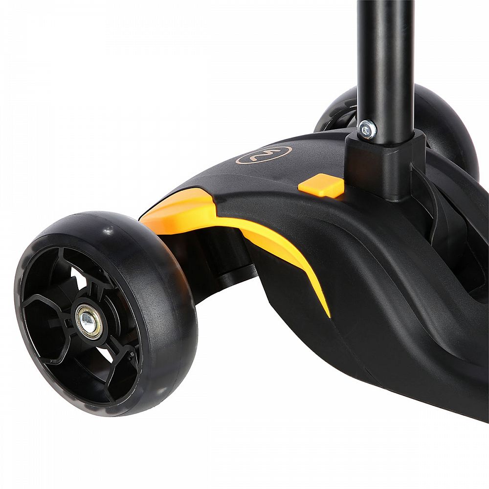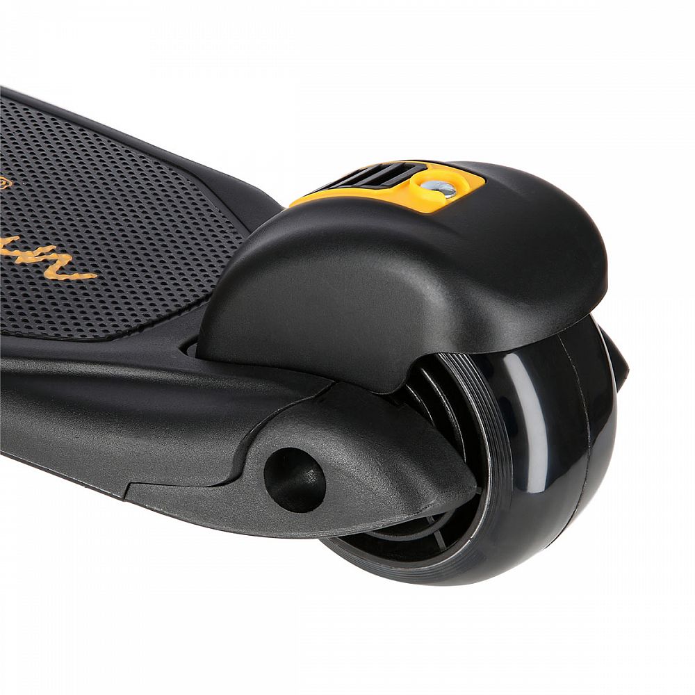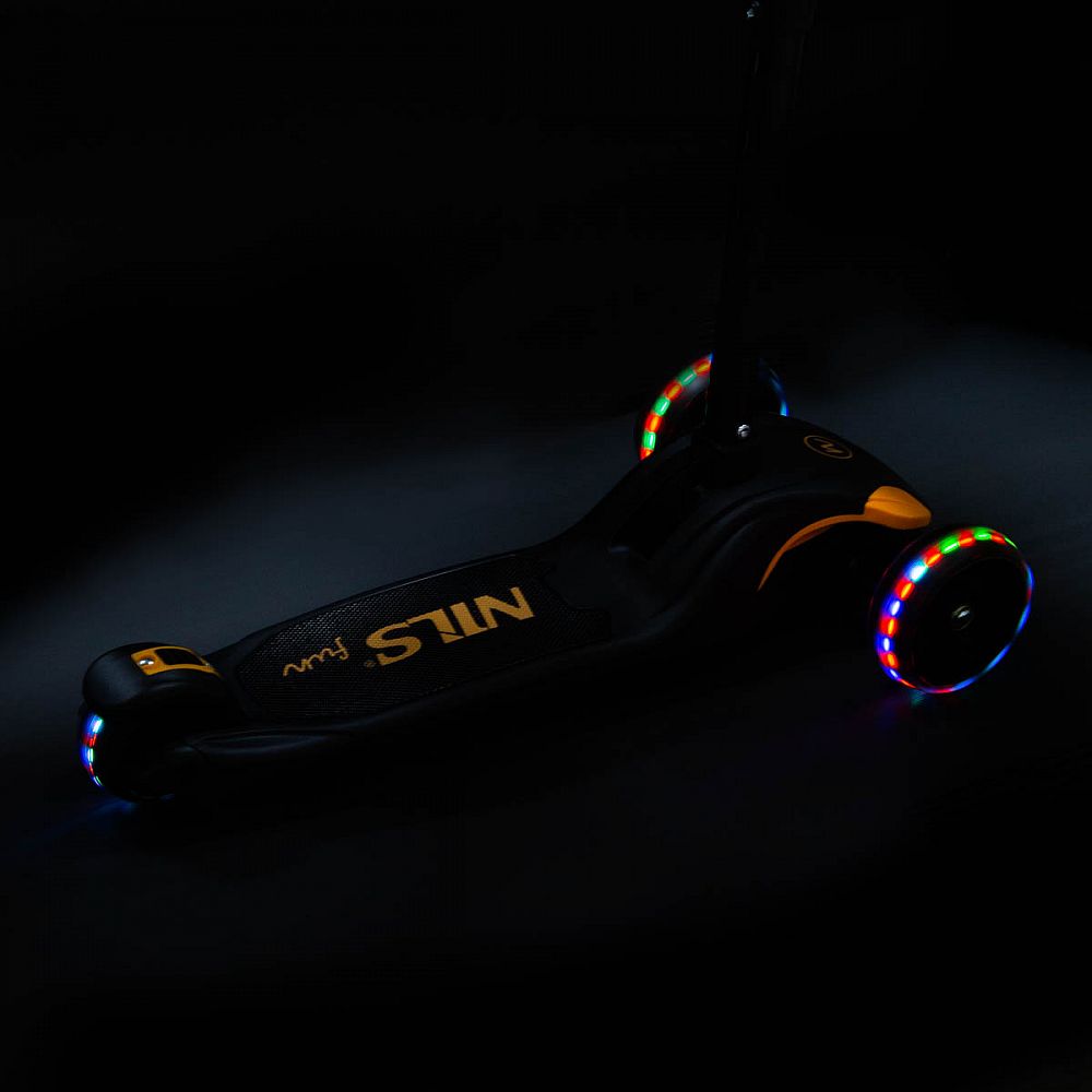 Přední kolečka jsou široká 40 milimetrů a zadní kolečko má šířku 50 milimetrů. Kolečka jsou osazeny ložisky ABEC 7 pro plynulou jízdu a navíc jsou vybavena svítícími LED diodami, které slouží jako zajímavý, vizuální prvek, zvyšují zájem dětí a v neposlední řadě zvyšují viditelnost koloběžky například za šera. Kolečka svítí automaticky během jejich otáčení. Zadní blatník slouží jako nášlapná brzda pro bezpečné zastavení koloběžky.