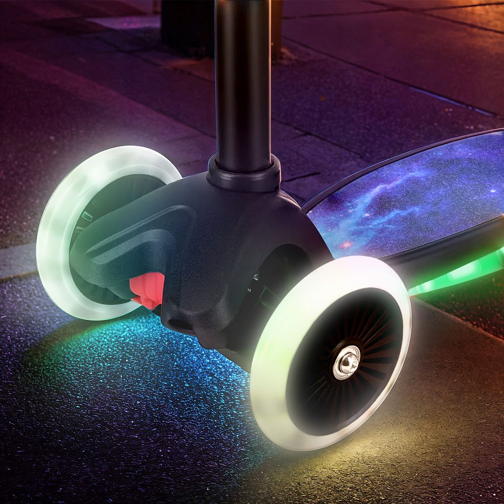Bezpečnost a pohodlí při jízdě jsou prioritou, proto je koloběžka HLB1310 vybavena protiskluzovou platformou o rozměrech 40 x 13,5 cm. Ta poskytuje dětským nohám větší přilnavost, což zvyšuje stabilitu a kontrolu nad koloběžkou. Světelný efekt navíc dodává koloběžce moderní, atraktivní vzhled, který osloví i nejmladší uživatele. LED panely v platformě jsou napájeny 3 bateriemi AAA (LR03), které je potřeba zakoupit samostatně.