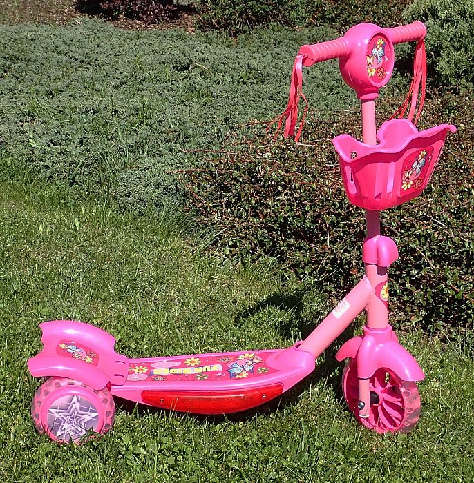 Koloběžka dětská je určena pro děti od 2 - 3 let. Materiál je ocel + plast. Kolečka jsou plastová, o průměru - přední 15 cm a zadní 11 cm. Rozměry výrobku - 54 x 21 x 58 cm, délka stupátka ( plocha pro nášlap nohy ) je 24 cm. Hmotnost koloběžky - 2,1 kg. Nosnost výrobku 30 kg. K dispozici v barvě růžové.Dodavatel: ACRA s.r.o., Brodská 161, Semily, 51301, 420481389087, obchod@acra.cz