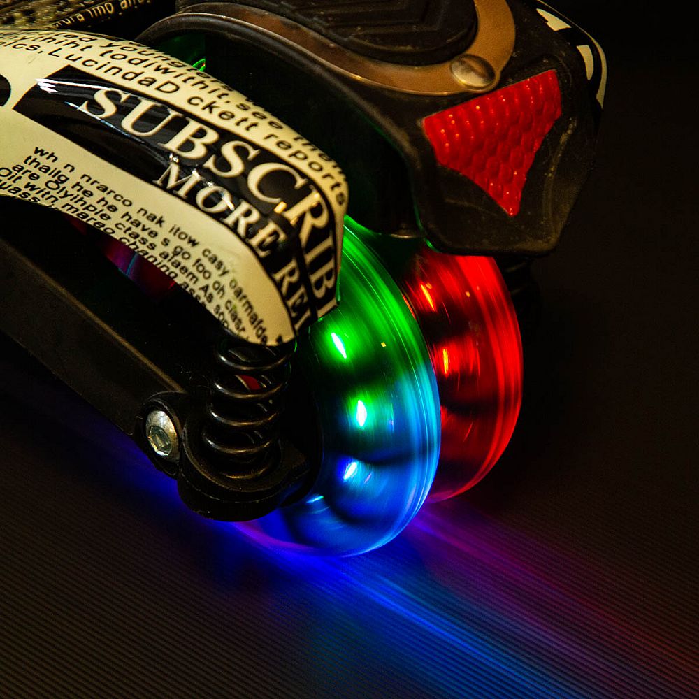 - Kolečka: přední LED PU 120mm/78A, zadní LED PU 80mm/78A