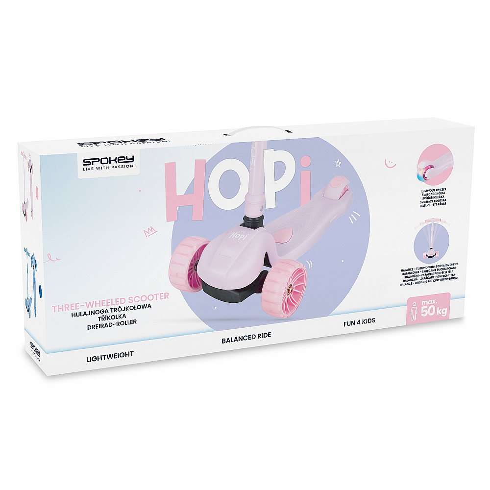 Balanční tříkolka Spokey HOPI je vybavena dvěma kolečky vpředu a širokým zadním kolečkem pro větší pohodlí a stabilitu při jízdě. Kolečka svítící během jízdy zvyšují viditelnost dítěte i po setmění a dodávají tříkolce atraktivitu. Kolečka jsou vyrobena z odolného a pružného polyuretanu, materiálu známého svou výjimečnou odolností a vynikající přilnavostí k zemi. Polyuretan svou konzistencí připomíná gumu, proto se často taková kolečka označují, jako "gumová kolečka". Díky svým vlastnostem poskytují tato kolečka hladkou a tichou jízdu a zároveň zaručují vysokou odolnost proti opotřebení.