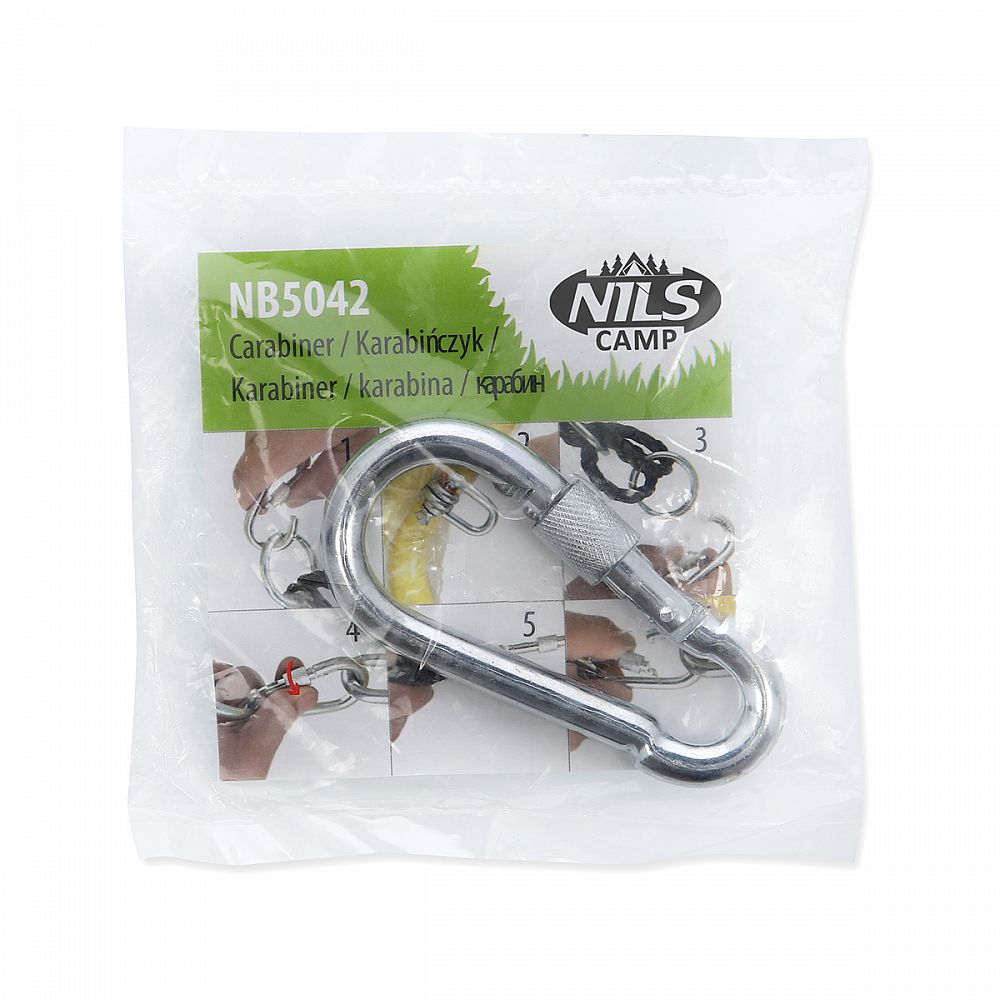 Ocelová karabina NILS Camp NB5042 s šroubovací pojistkou váží pouhých 9 gramů, při zamknuté pojistce má ale nosnost až 500 kilogramů.