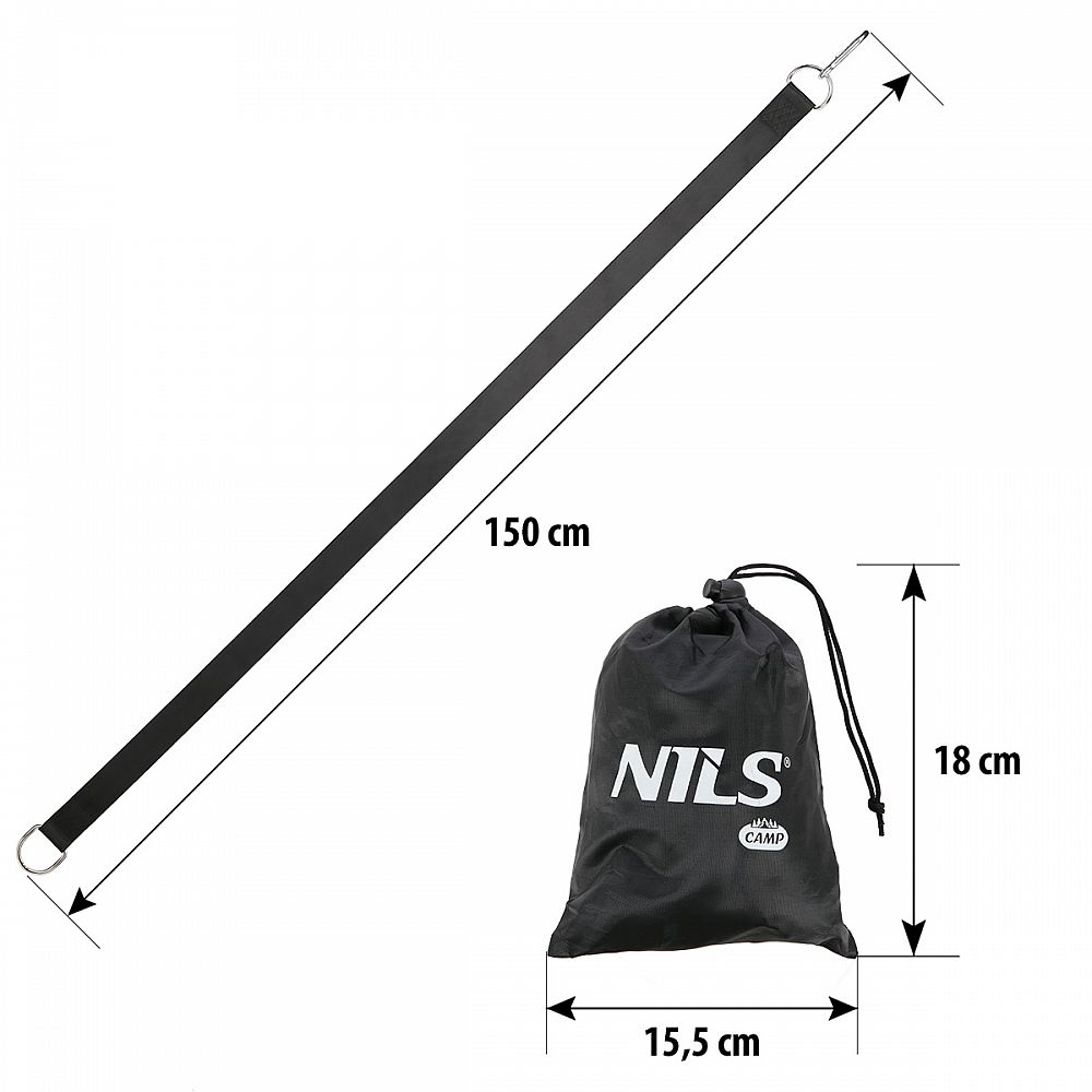 Sada 2 polyesterových popruhů s ocelovými oky NILS Camp NC1722 je určen k zavěšení houpaček, houpacích sítí, posilovacích systémů a brazilských křesel všude tam, kde nestačí délka originálních lan. Pokud máte například trámy na terase příliš vysoko pro zavěšení houpačky, nebo stromy na zahradě jsou příloš daleko pro napnutí hamaky, pak je NC1722 ideální řešení. V případě potřeby lze více popruhů spojit pomocí karabin.