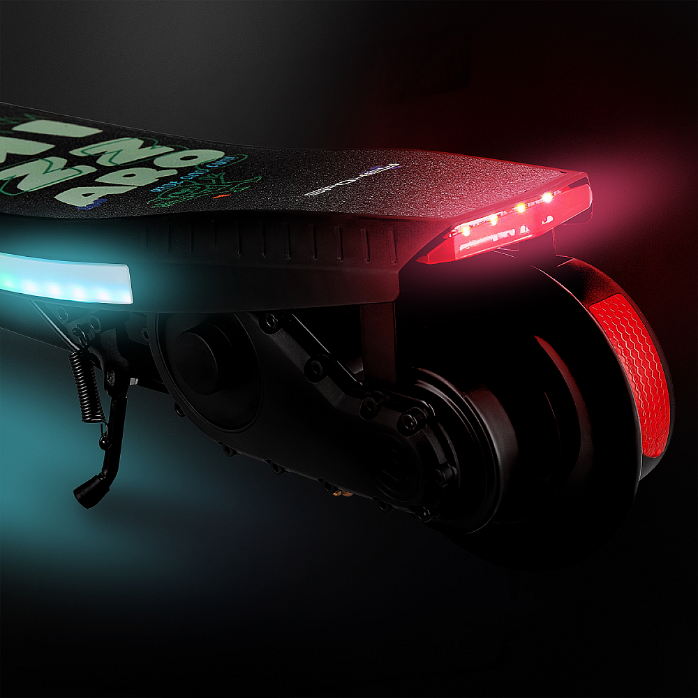 - Maximální viditelnost: Přední bílá a zadní červená LED světla, spolu s barevným LED páskem na desce, zajistí skvělou viditelnost i po setmění.