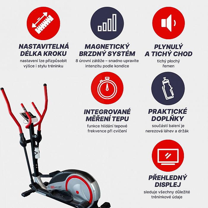 Magnetický eliptical BE91, je robustní posilovací stroj s následujícími parametry:- magnetická brzda s osmi stupni zátěže