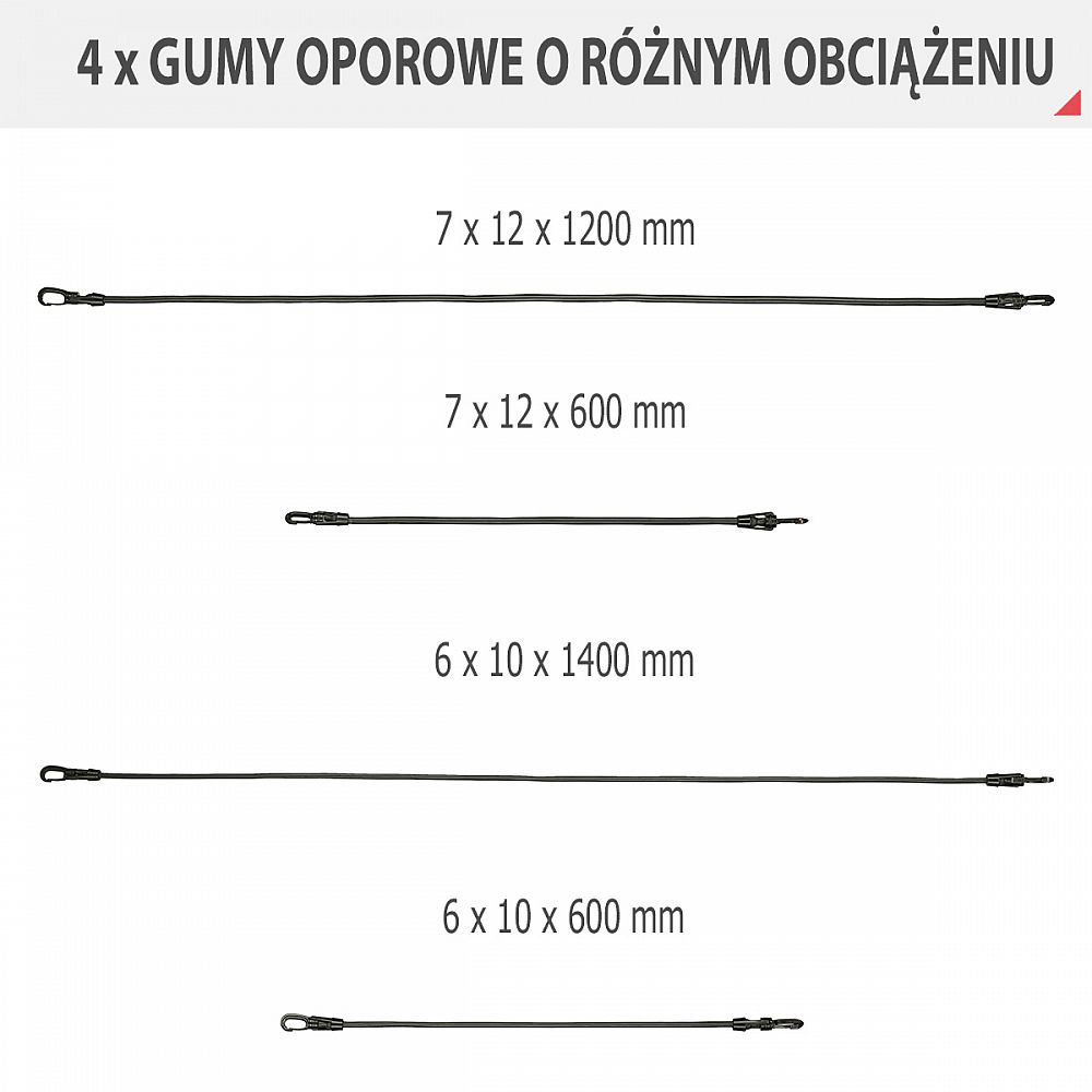 - Univerzálnost – přidávejte další gumy pro zvýšení odporu pomocí funkčních karabin, měňte úhel tréninku přesunutím úchytu úchytu za dveře a střídejte cvičené končetiny výměnou rukojetí.
