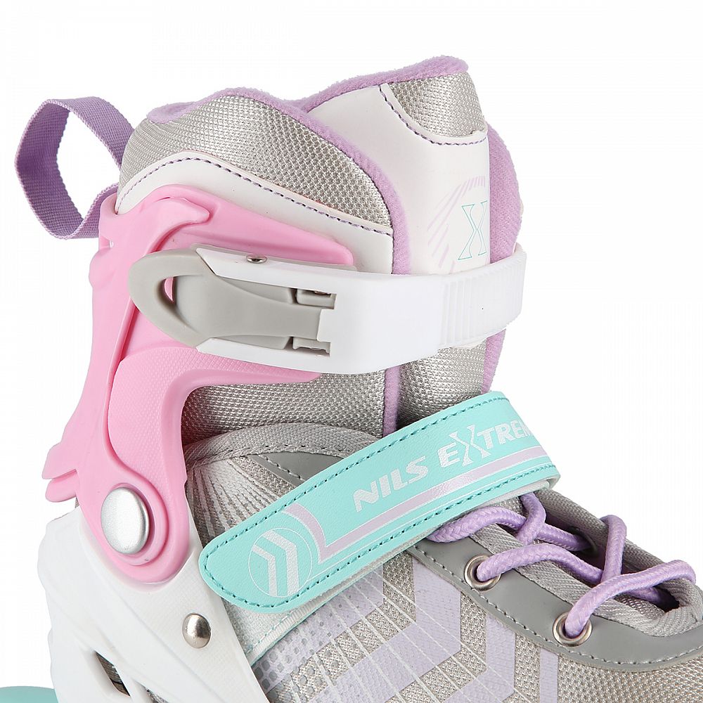 NILS Extreme NH18192 jsou kolečkové brusle 4v1 s vyměnitelným nožem na led, které jsou určeny pro začínající a středně pokročilé uživatele. Hliníkový podvozek je osazen měkkými PU kolečky s ložisky ABEC7 pro svižnou jízdu. Vnější bota je pomocí stisku tlačítka nastavitelná do čtyř velikostí, toto řešení umožňuje precizní přizpůsobení velikosti podle aktuálních potřeb anebo se používá jako "rostoucí bota", která "roste" spolu s nohou dítěte. Na špičce jsou ventilační otvory pro maximální prodyšnost. Vnitřní bota je vyrobena z kombinace semiše, síťoviny MESH, EVA a pěny o vysoké hustotě. Zapínání je řešenou klasickou trojkombinací - šněrování, řemínek se suchým zipem a dvousekční přezka. Součástí balení je sada šroubů a podložek pro přestavbu podvozku do konfigurace 2+1 a 2+2 a pár nožů na led, které jsou vyrobeny z nerez oceli s vysokým podílem uhlíku.