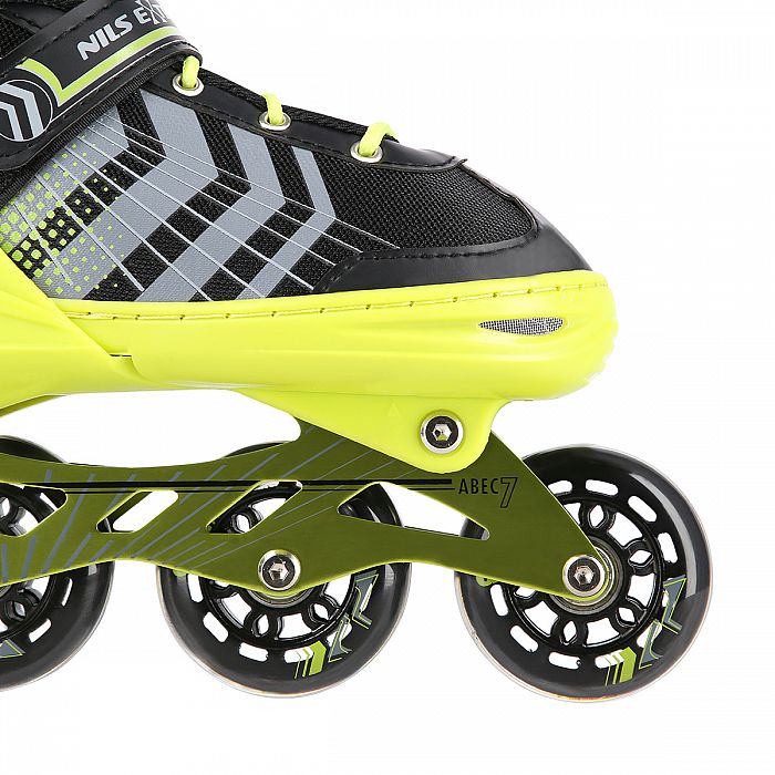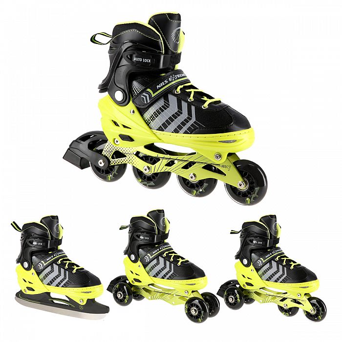 NILS Extreme NH18192 jsou kolečkové brusle 4v1 s vyměnitelným nožem na led, které jsou určeny pro začínající a středně pokročilé uživatele. Hliníkový podvozek je osazen měkkými PU kolečky s ložisky ABEC7 pro svižnou jízdu. Vnější bota je pomocí stisku tlačítka nastavitelná do čtyř velikostí, toto řešení umožňuje precizní přizpůsobení velikosti podle aktuálních potřeb anebo se používá jako "rostoucí bota", která "roste" spolu s nohou dítěte. Na špičce jsou ventilační otvory pro maximální prodyšnost. Vnitřní bota je vyrobena z kombinace semiše, síťoviny MESH, EVA a pěny o vysoké hustotě. Zapínání je řešenou klasickou trojkombinací - šněrování, řemínek se suchým zipem a dvousekční přezka. Součástí balení je sada šroubů a podložek pro přestavbu podvozku do konfigurace 2+1 a 2+2 a pár nožů na led, které jsou vyrobeny z nerez oceli s vysokým podílem uhlíku.