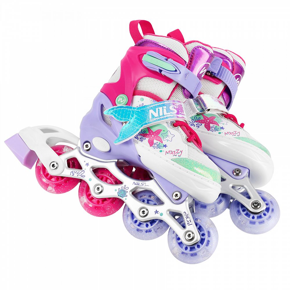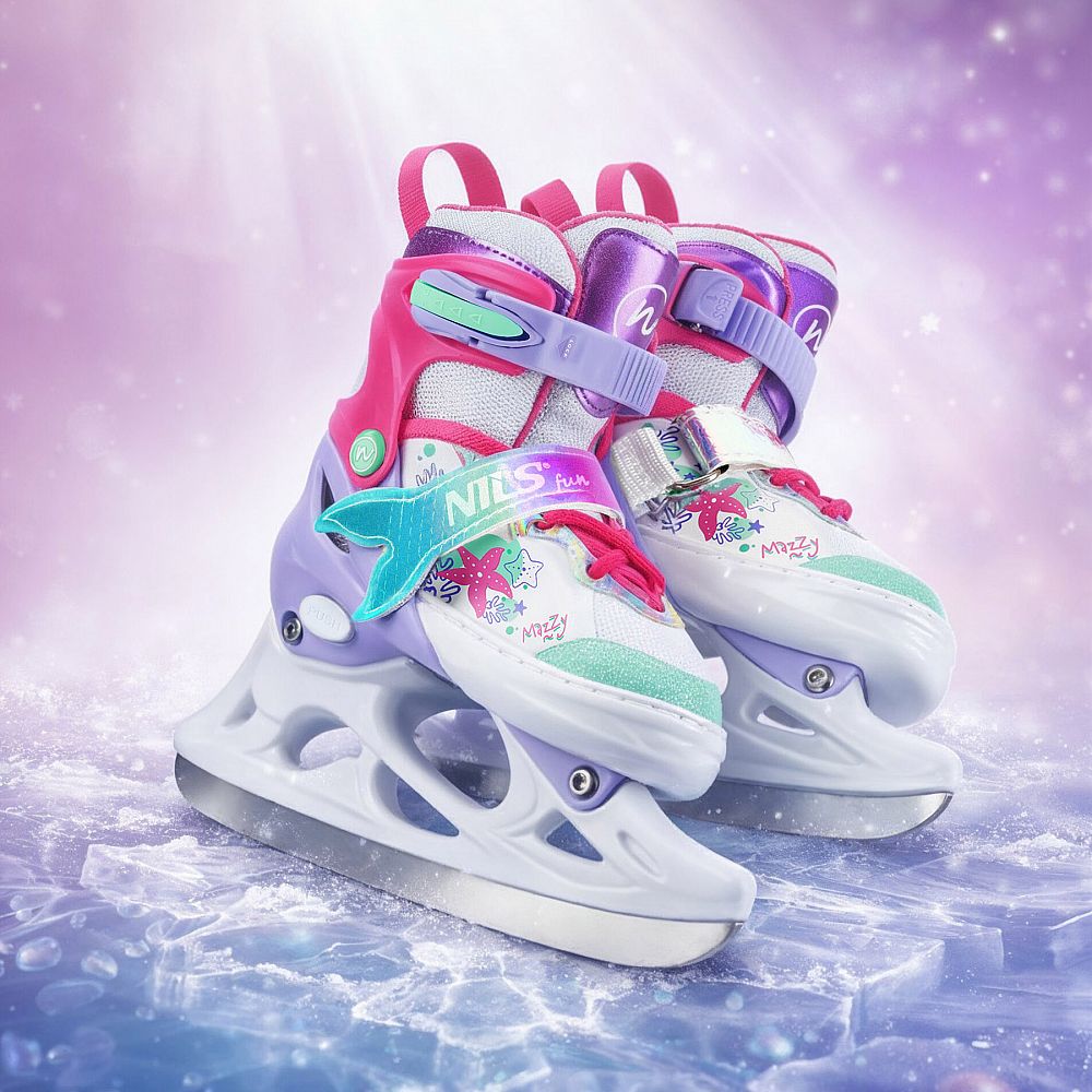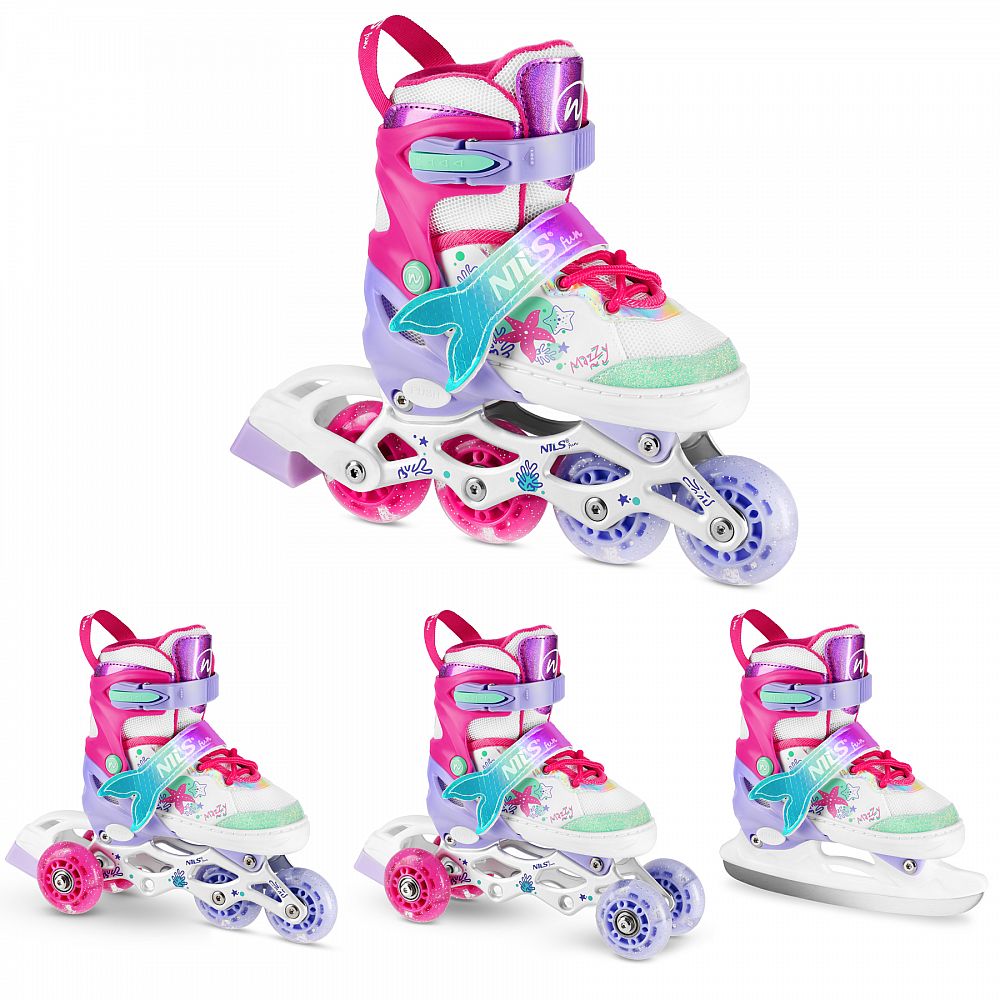 NH18150 MAZZY značky NILS Fun je jedinečný dětský set 4v1, který spojuje funkčnost, bezpečnost a atraktivní pohádkový design inspirovaný podmořským světem. Jeden produkt nabízí hned čtyři konfigurace – kolečkové brusle, lední brusle, quad brusle a 2+1+1 pro začátečníky – a je tak ideální pro celoroční využití.