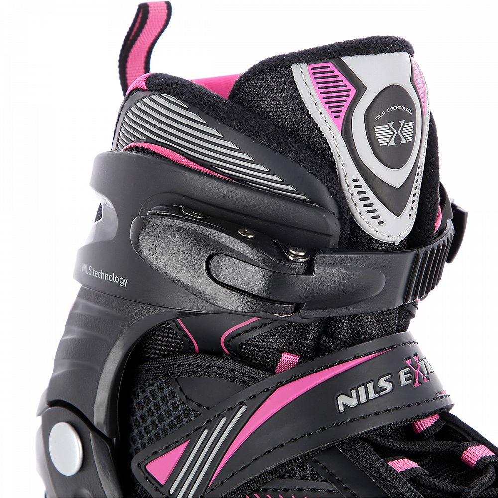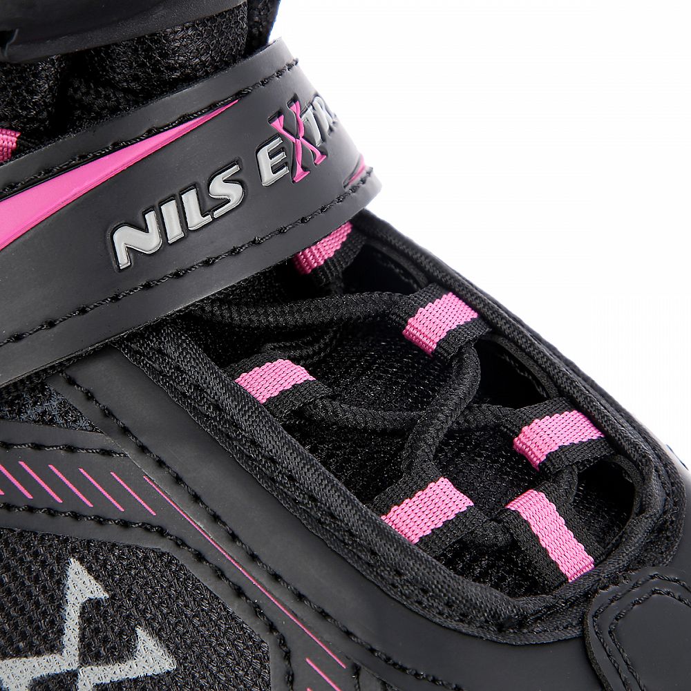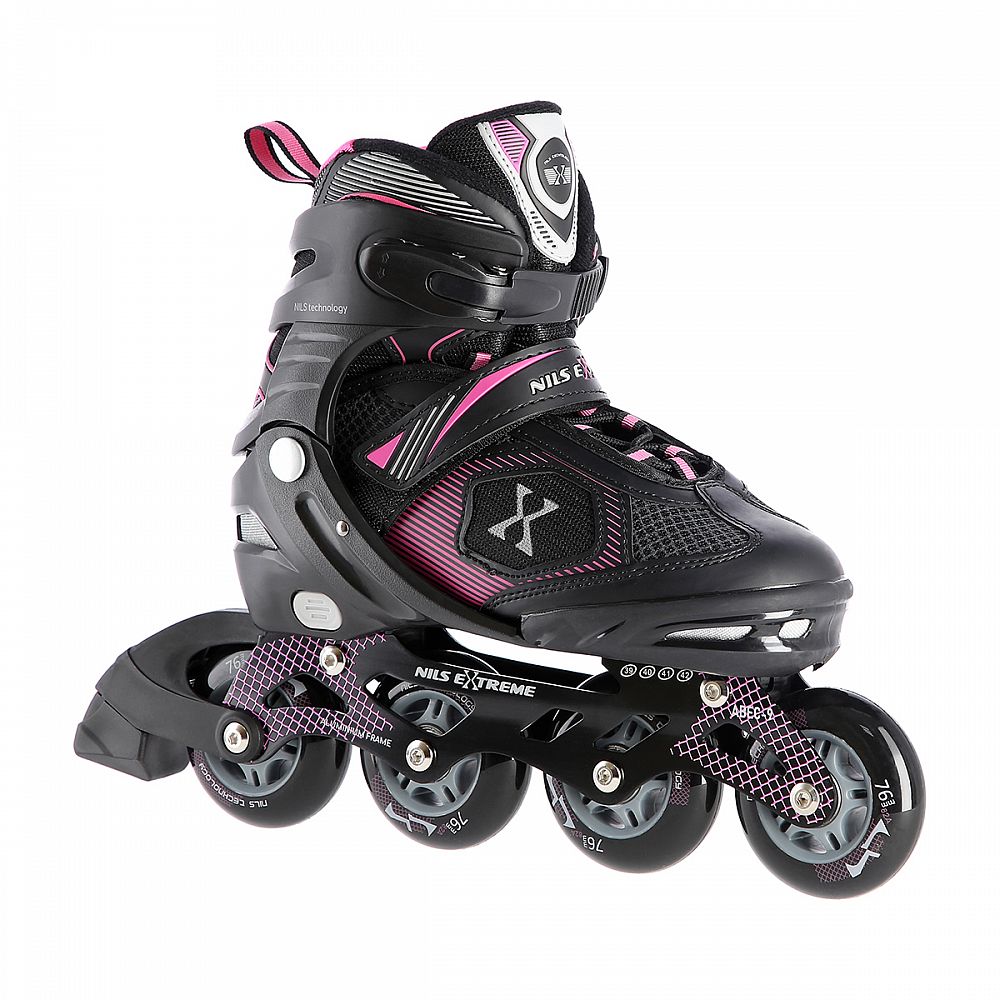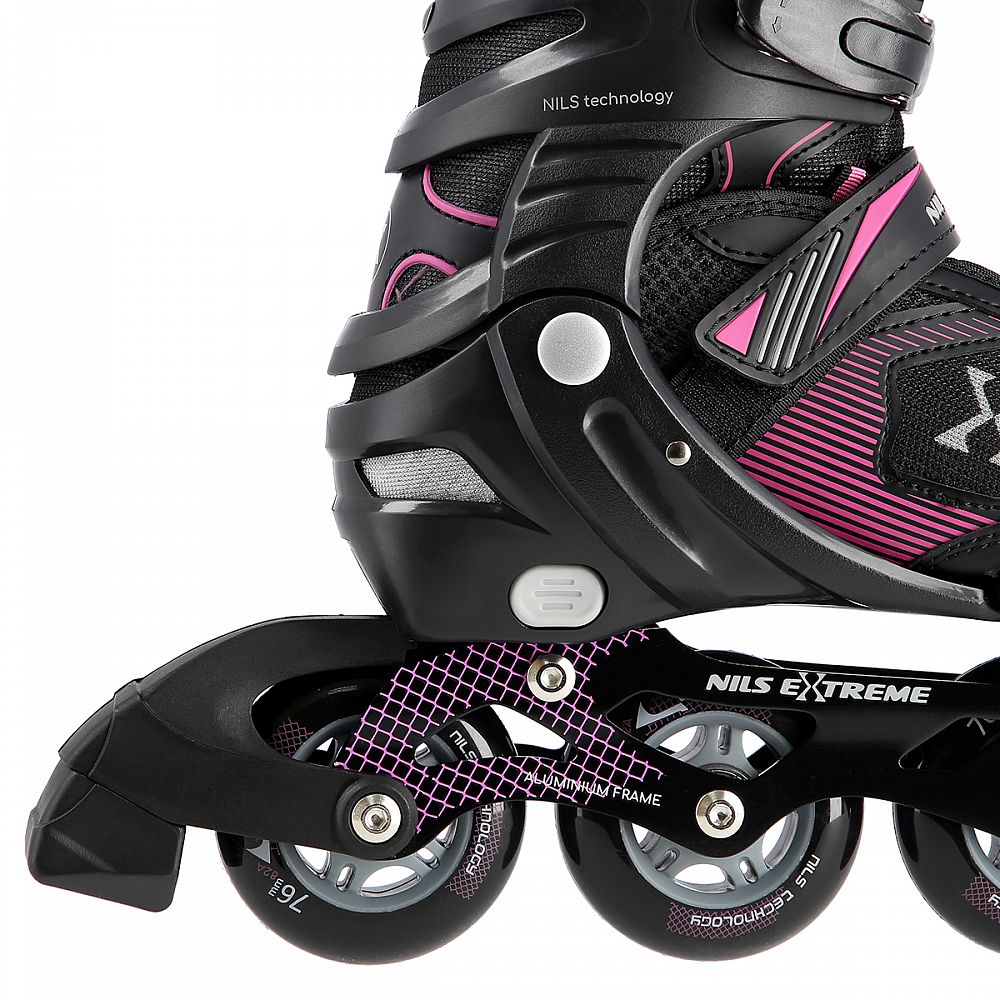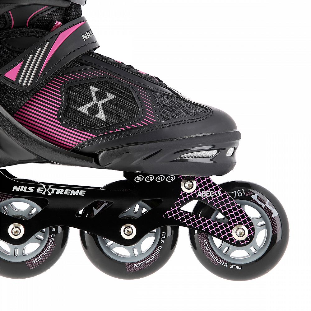 Kolečkové brusle NILS Extreme NA9080 jsou určeny k rekreační jízdě začínajících a mírně pokročilých bruslařů po rovných a hladkých stezkách, jako například po asfaltu. Lehká a odolná bota zajišťuje bezpečnost při jízdě. Systém ventilace a tvarovaná stélka boty přímo ovlivňují zvýšení uživatelského komfortu. Jedná se o model s nastavitelnou velikostí, kdy každá brusle má na výběr ze 4 rozměrů. Pomocí jednoduchého řídicího systému lze snadno a rychle nastavit velikost boty na noze uživatele. Kolečka s tvrdostí 82A jsou uložena v hliníkové liště, dobře přiléhají k podkladu a částečně pohlcují nervnosti. Model NA9080 je osazen ložisky ABEC 9, která se vyznačují precizním zpracováním a nízkým odporem, kdy jízda má dobrou setrvačnost a na bruslích tak lze urazit dlouhou vzdálenost bez vynaložení zbytečné síly.