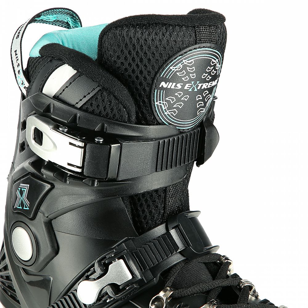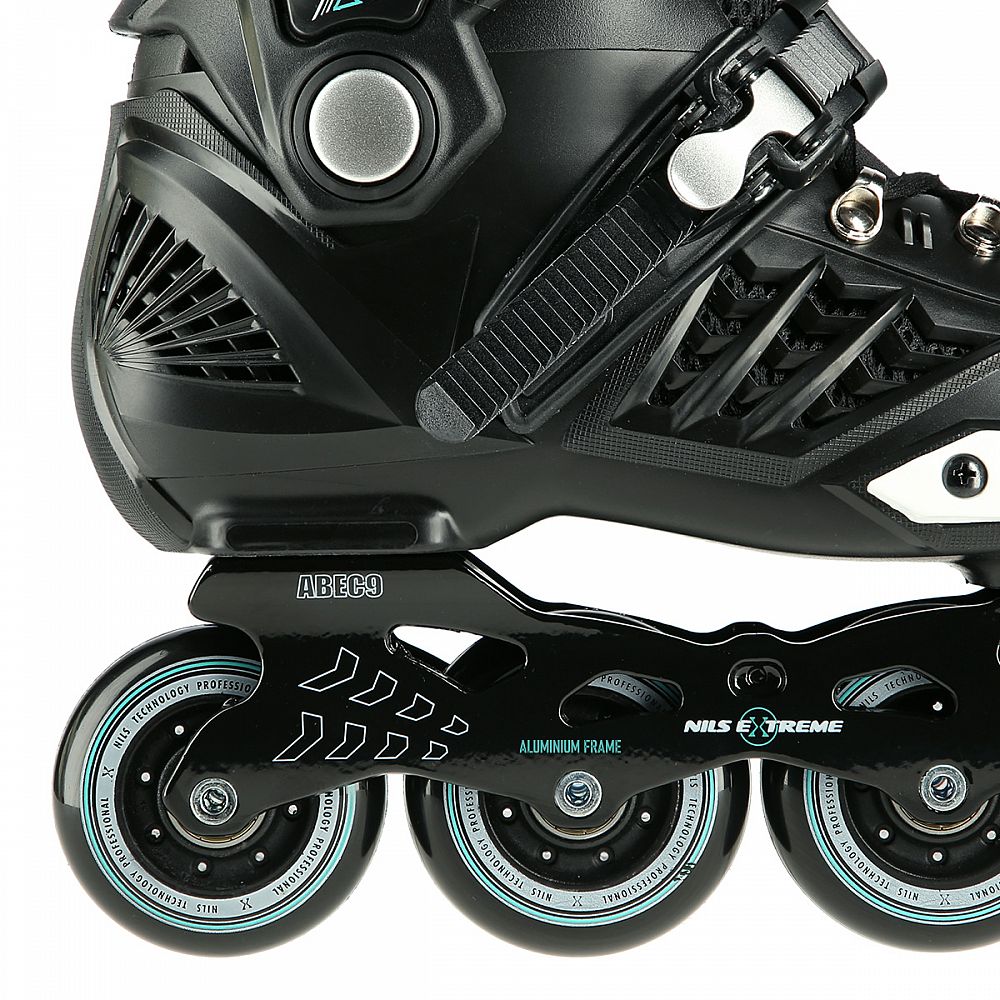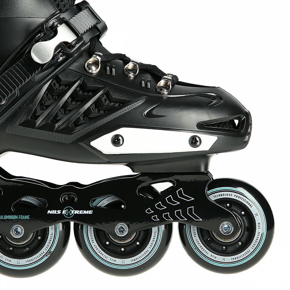 Kolečkové brusle NILS Extreme NA20001 jsou určeny primárně pro freeride a slalom. Jejich konstrukce je založena na lehké, větrané botě s anatomickou stélkou zaručující vysokou stabilitu paty, polypropylenovém skeletu a hliníkové liště vyrobené pomocí vstřikování. Jako zapínání bylo použito šněrování, dvojsekční přezky a kvalitní spony s napínacím mechanismem. Na vnější straně boty nalezneme slider, tak často užívaný při freeridu.