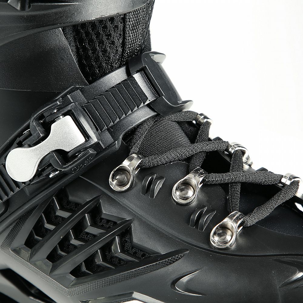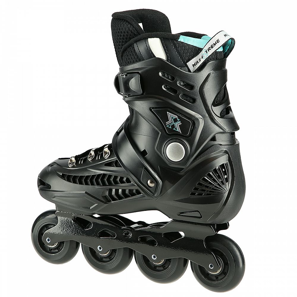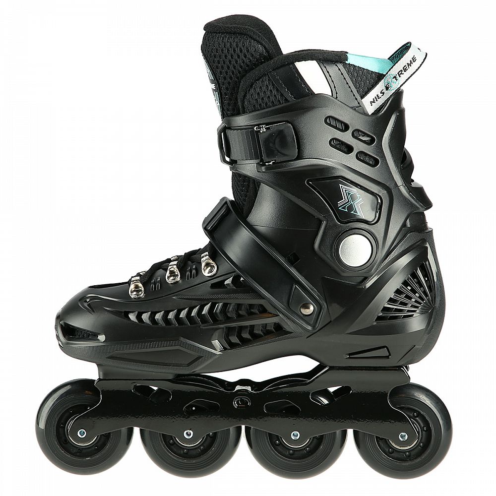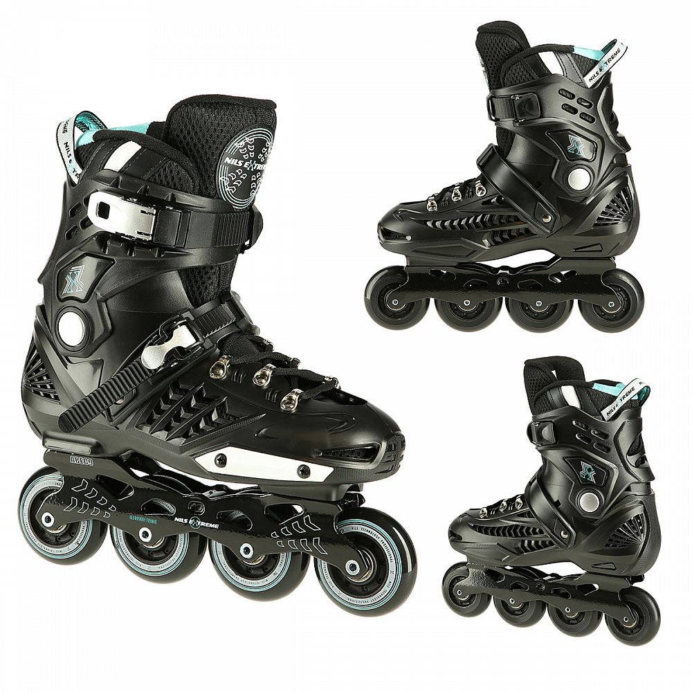 Kolečkové brusle NILS Extreme NA20001 jsou určeny primárně pro freeride a slalom. Jejich konstrukce je založena na lehké, větrané botě s anatomickou stélkou zaručující vysokou stabilitu paty, polypropylenovém skeletu a hliníkové liště vyrobené pomocí vstřikování. Jako zapínání bylo použito šněrování, dvojsekční přezky a kvalitní spony s napínacím mechanismem. Na vnější straně boty nalezneme slider, tak často užívaný při freeridu.