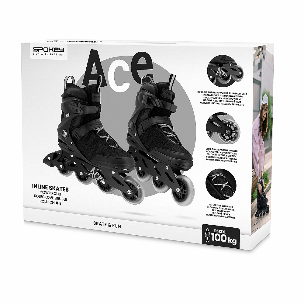 Fitness brusle Spokey ACE byly navrženy s ohledem na rekreační jízdu, přičemž kombinují moderní, minimalistický design s vysokou funkčností. Jejich semi-soft bota poskytuje komfort a adekvátní odvětrávání. Odolný hliníkový rám zaručuje stabilitu a lehkost celé konstrukce.