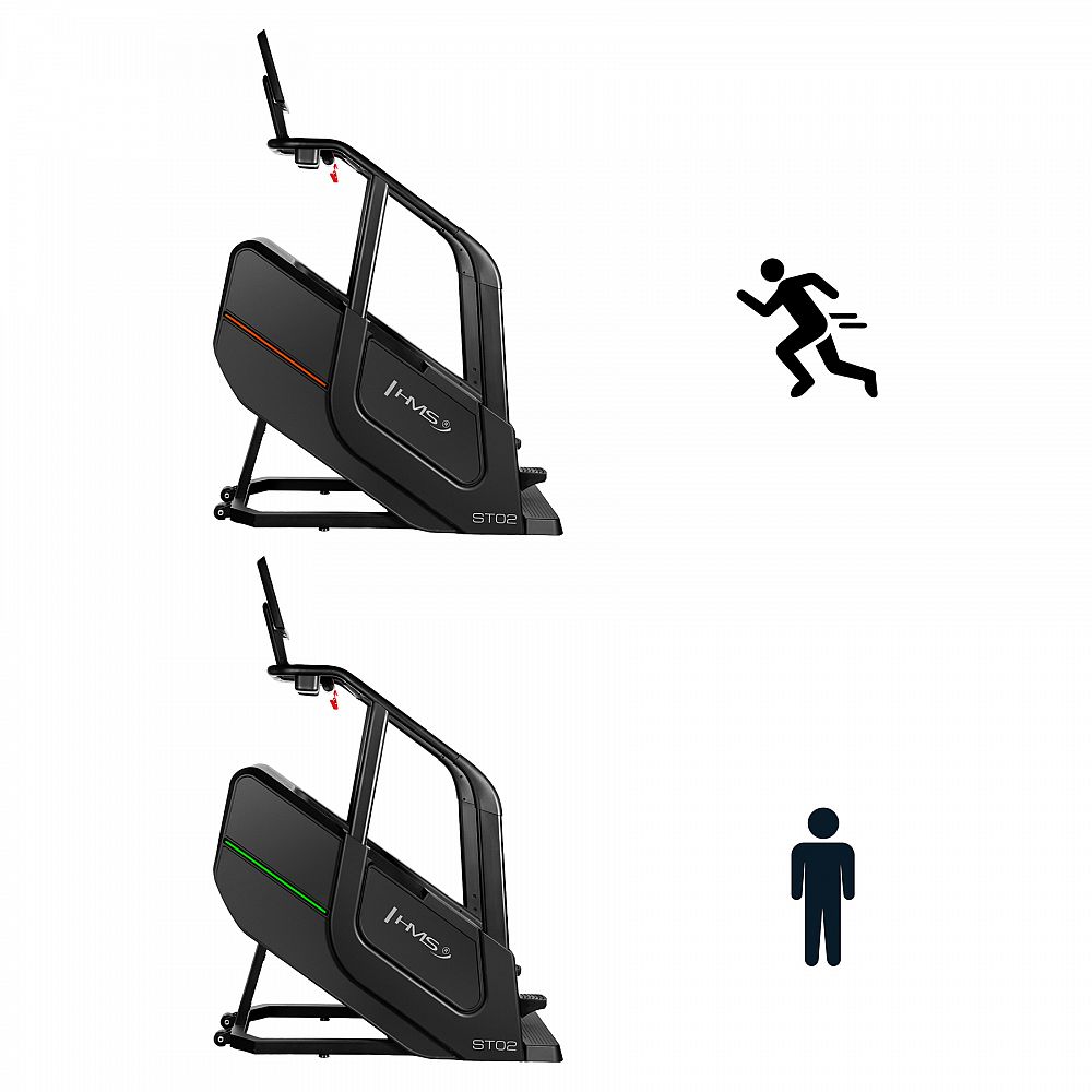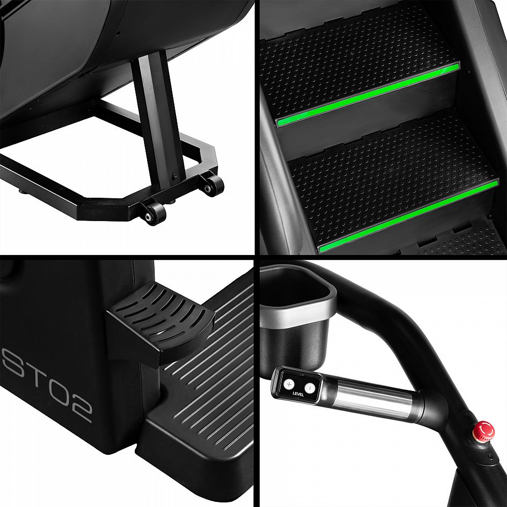 Schody ST02 je vybaven funkcemi měření rychlosti, počtu kroků, vystoupané výšky, času, spálených kalorií, tepové frekvence a tělesného tuku, které vám umožní sledovat vaše pokroky a přizpůsobit trénink vašim individuálním cílům. Bezdrátová nabíječka umožňuje pohodlné nabíjení mobilních zařízení během cvičení. Intuitivní ovládací panel s tlačítky pro regulaci rychlosti a tlačítky start/stop na madlech zajišťuje jednoduché a rychlé ovládání.