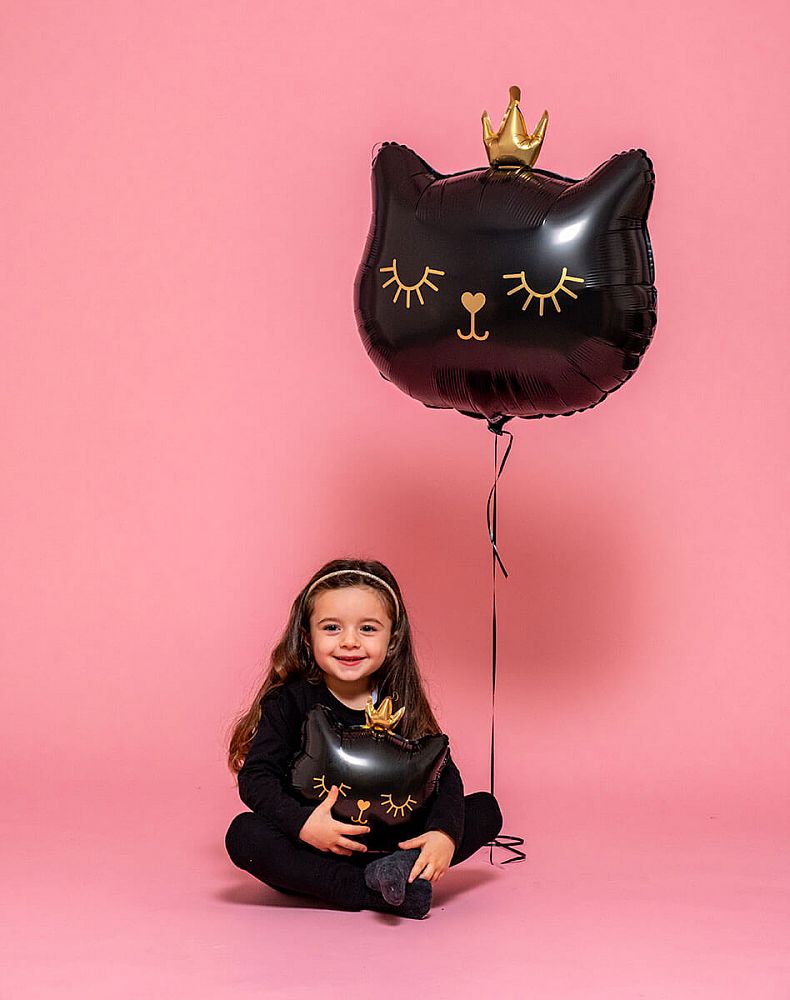 Foliový balónek ve tvaru hlavy černé kočky se zlatými detaily a korunkou. Skvělá dekorace na narozeniny nebo halloweenskou party a oslavu. Perfektní pro milovníky chlupatých miláčků, kteří nejsou zrovna na růžovou.