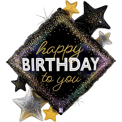 Foliový balonek hranatý s nápisem Happy Birthday to You! a černými, stříbrnými a zlatými hvězdami kolem. Hodí se jako dekorace na narozeninovou oslavu nebo jako pozorný dáreček oslavenci. Zábavný balonek, který vždy perfektně doplní jakoukoliv výzdobu.