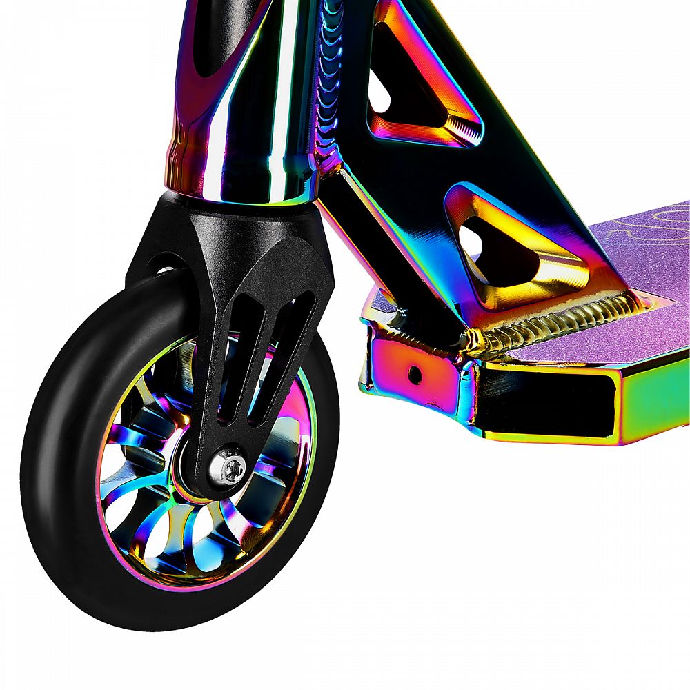 Freestylová koloběžka nemá žádný skládací mechanismus ani systém nastavení výšky řídítek - tyto typy řešení by mohly oslabit celou konstrukci, což samozřejmě není žádoucí u produktu, kde je odolnost zásadní. Při provádění triků se konstrukce setkává s velmi vysokým zatížením. Díky použití pevné oceli a silného hliníku je téměř nemožné koloběžku HS014 PRO dostat na limit a tak můžete i složité a náročné triky provádět s maximální jistotou.