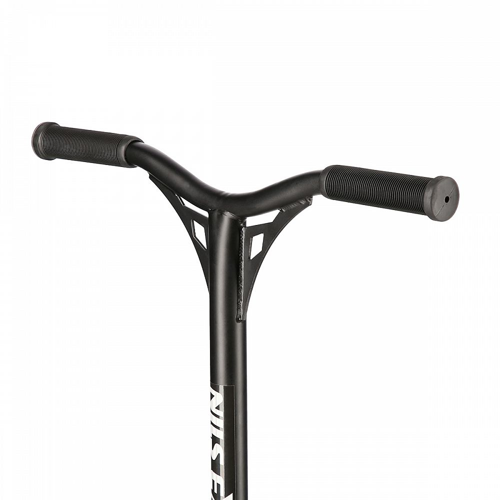 Řídítka jsou k ocelové, bezzávitové vidlici připevněny pomocí 4-šroubové svorky, lze je tak snadno vyměnit. Robustní deck má dvě příčky a tři komory. Gumové gripy pohlcují nežádoucí vibrace.
