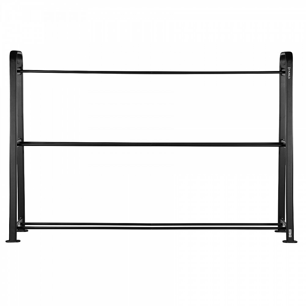 Stojan STR43 se třemi úrovněmi uložení umožňuje přehledné rozdělení míčů podle velikosti a barvy. Na spodní polici jsou uloženy černé míče, uprostřed fialové a na horní polici grafitové, což nejen usnadňuje přístup k vybavení, ale také dodává tréninkovému prostoru moderní a profesionální vzhled.